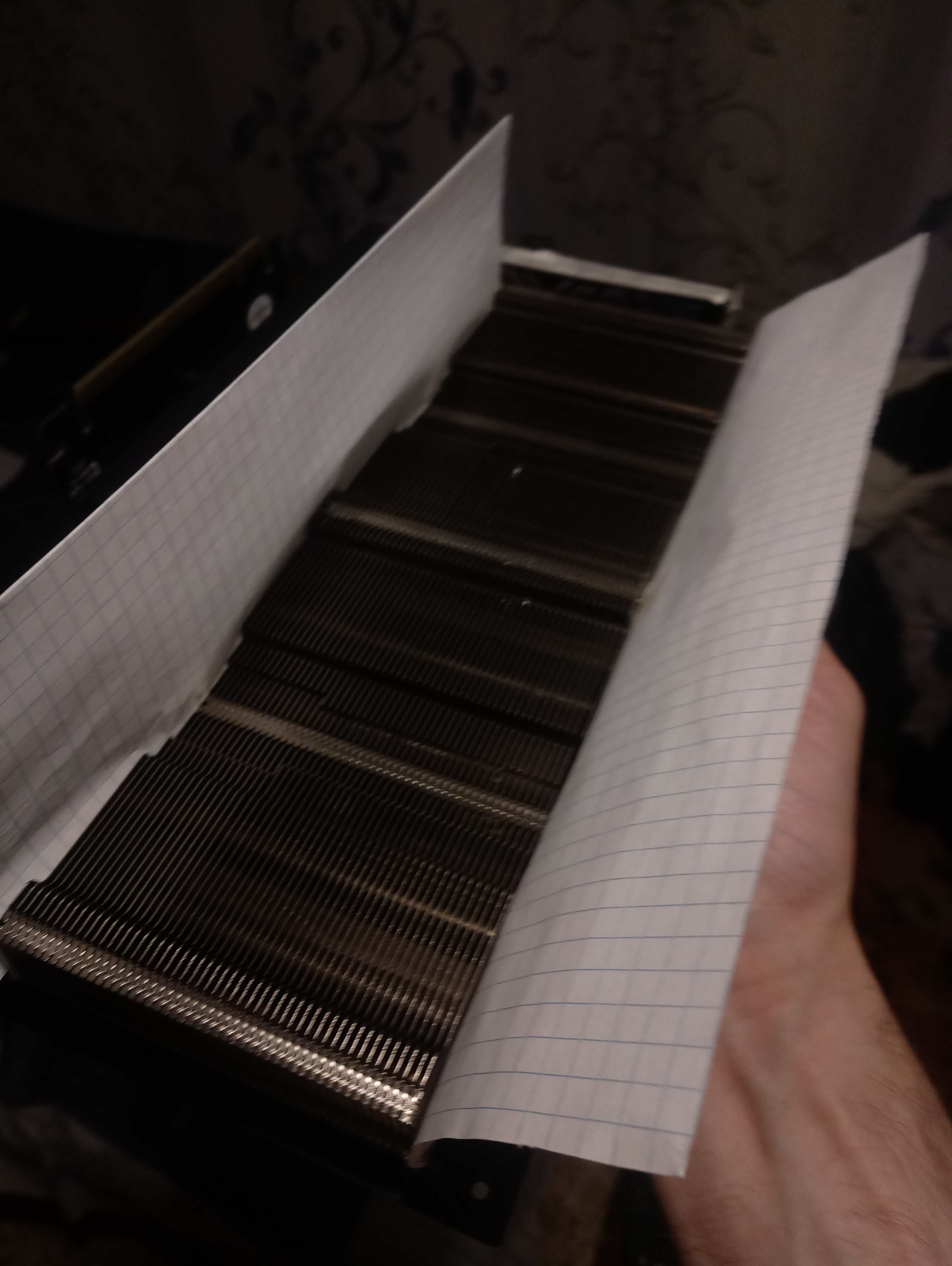 Ключевая идея в том, чтобы увеличить статическое давление, и продувать т.о. радиатор памяти. Следуя ей, я решил сконцентрировать весь воздушный поток на радиаторе. Для теста концепции я приклеил обычную бумажку вклеточку к радиатору на малярный скотч, а с другой стороны плотно обжал вокруг вентиляторов.. Если это работает впринципе, то сработает даже так.