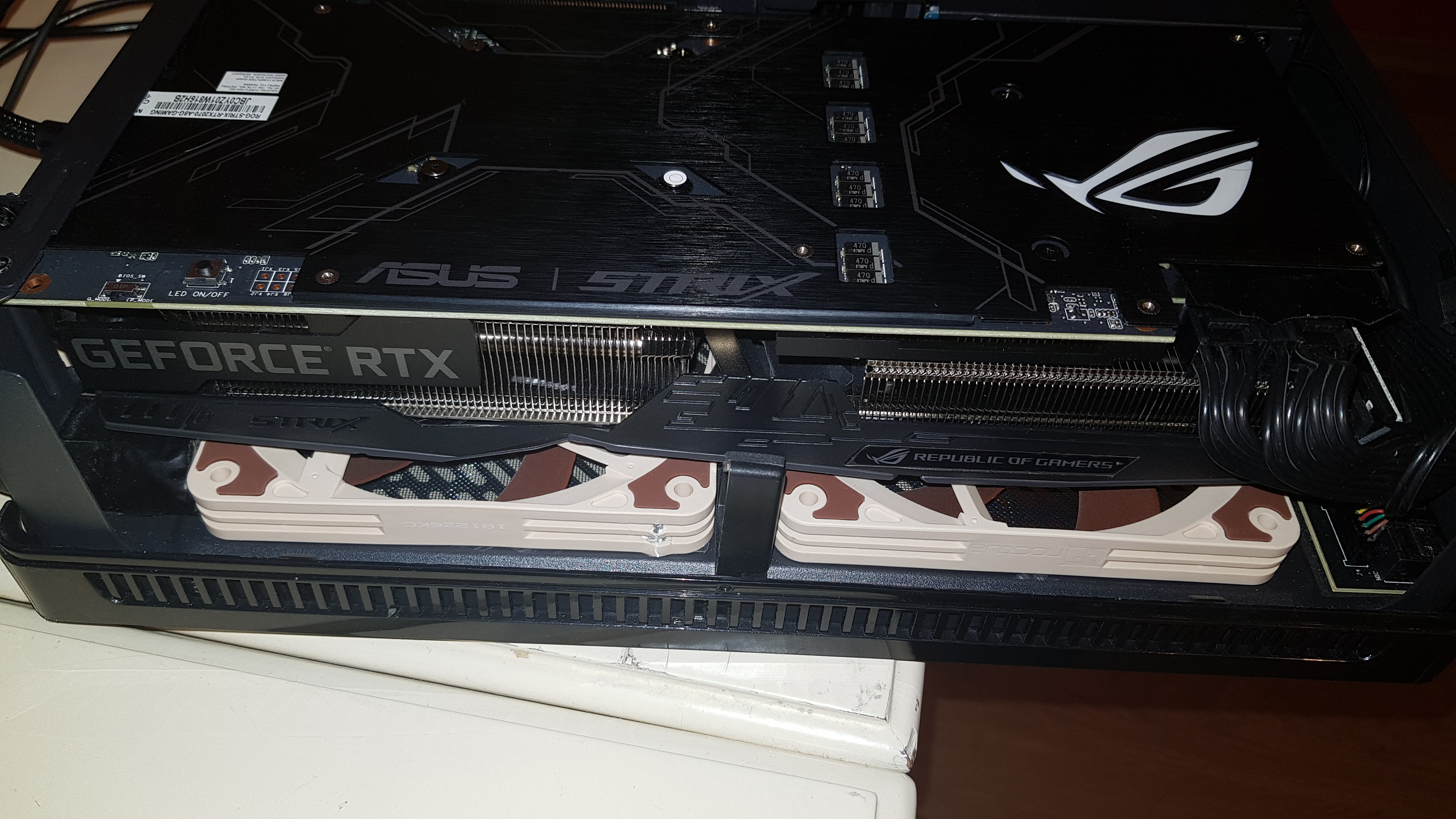 Помимо перебора других комбинаций с "концентратором" я возлагаю большие надежды на смещение вентиляторов ближе к портам, так, чтобы они заняли те же места, что и родные вентиляторы видеокарты. Но этому препятствует разъем питания - можно попробовать его разрезать, удалив пластиковый кожух и оставив только провода с термоусадкой...