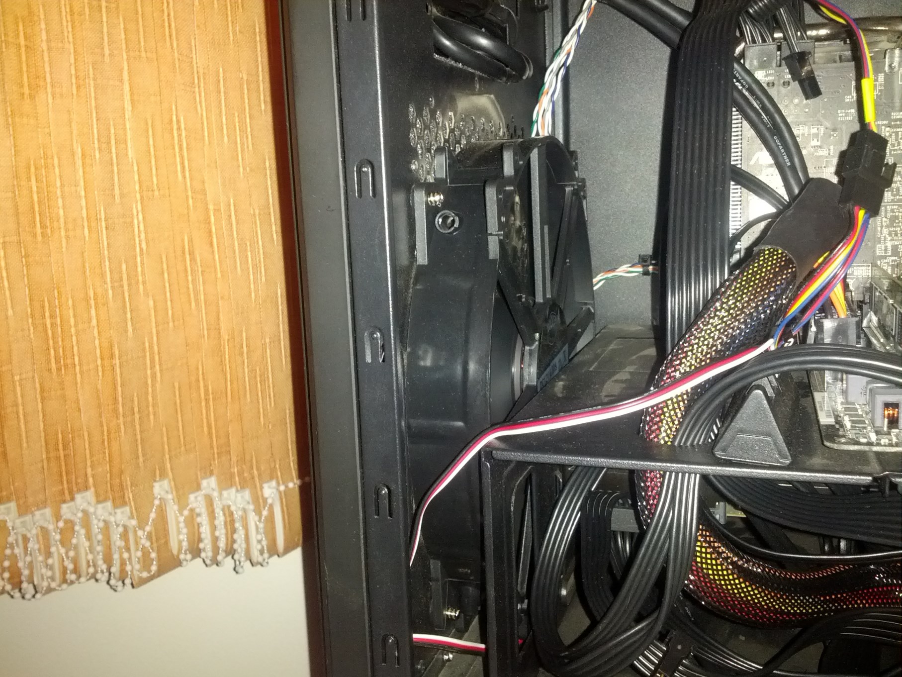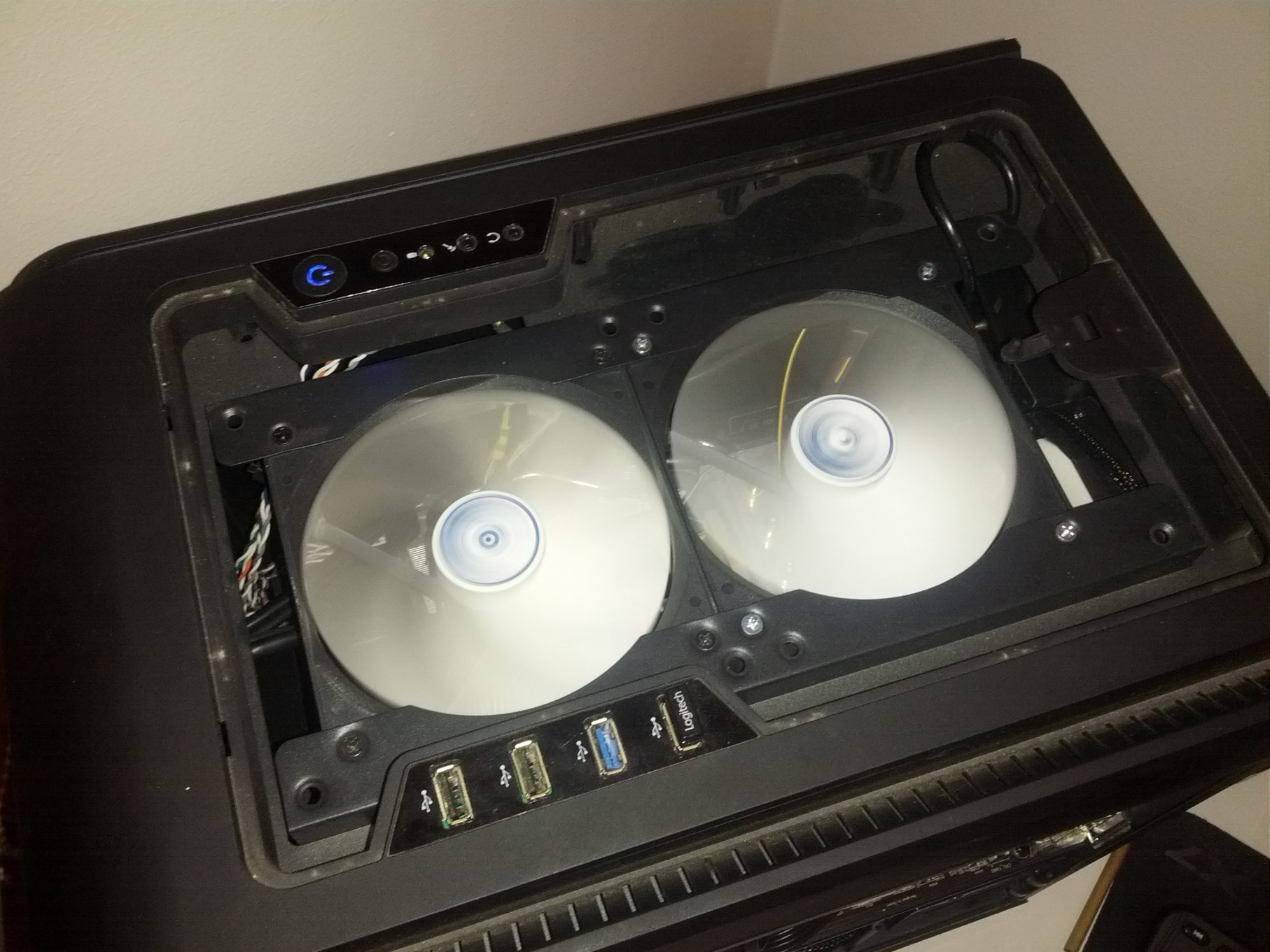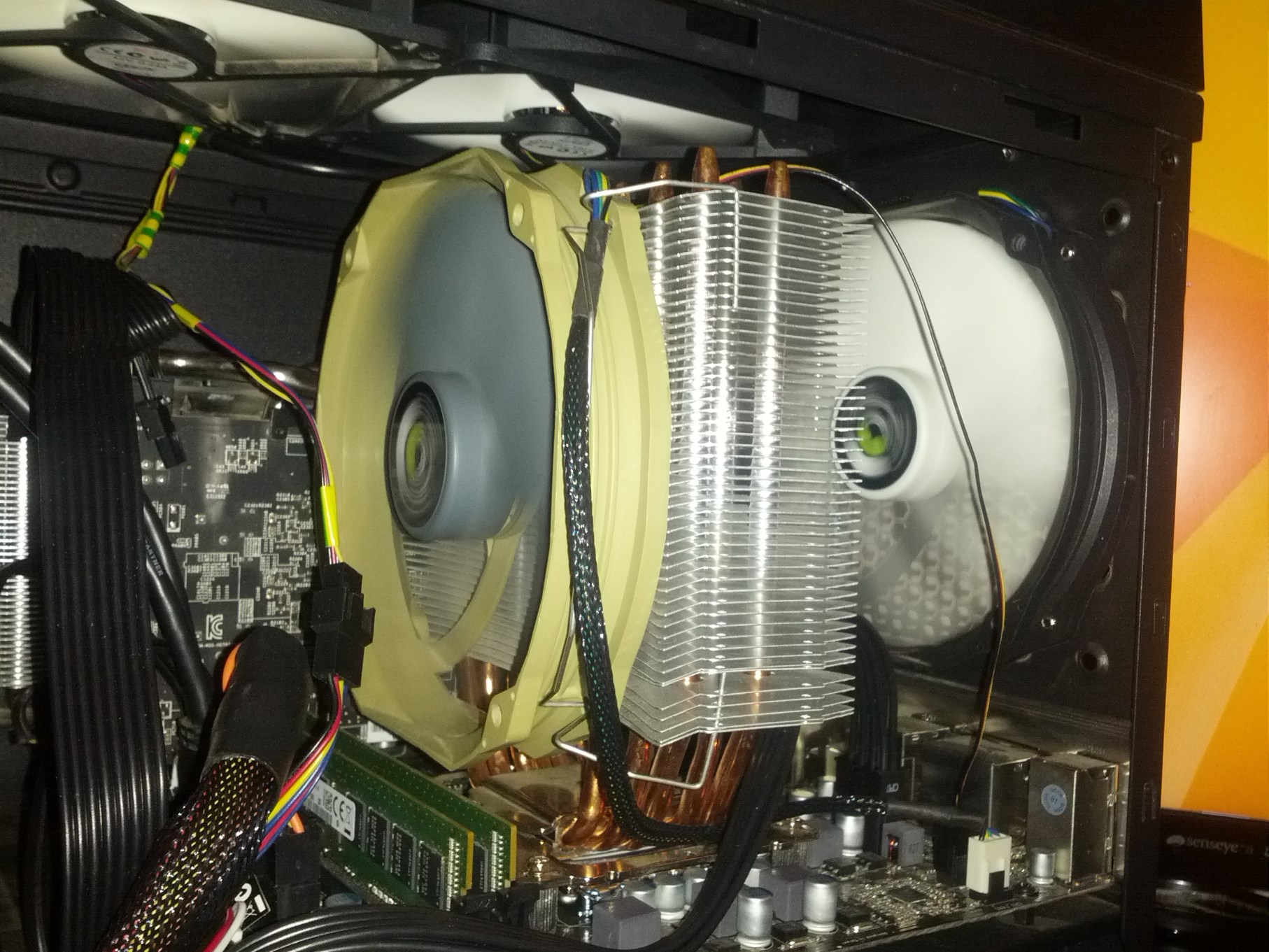 Установил спереди Cooler Master MegaFlow 200 внутрь корпуса, снаружи на скотч повесил поролон (что с матерями идет) на весь периметр отверстий. Сверху 2х120 Arctic Cooling F12 PWM на вдув - создают сплошной поток свежего воздуха на, почти, весь объем корпуса. На процессоре Thermalright TY-143, на выдув Thermalright TY-147. Все это дело, кроме TY-143, висит на разветвителе DeepCool Fun Hub. В биосе поставил самое минимальное вращение для всего этого добра - от 500 до 700 оборотов. Уже с метра ничего не слышно. Запускал Linx и Heaven одновременно - сзади выходит еле теплый воздух. Еще проц. скальпирую как-нибудь и, думаю, вообще красота будет.
