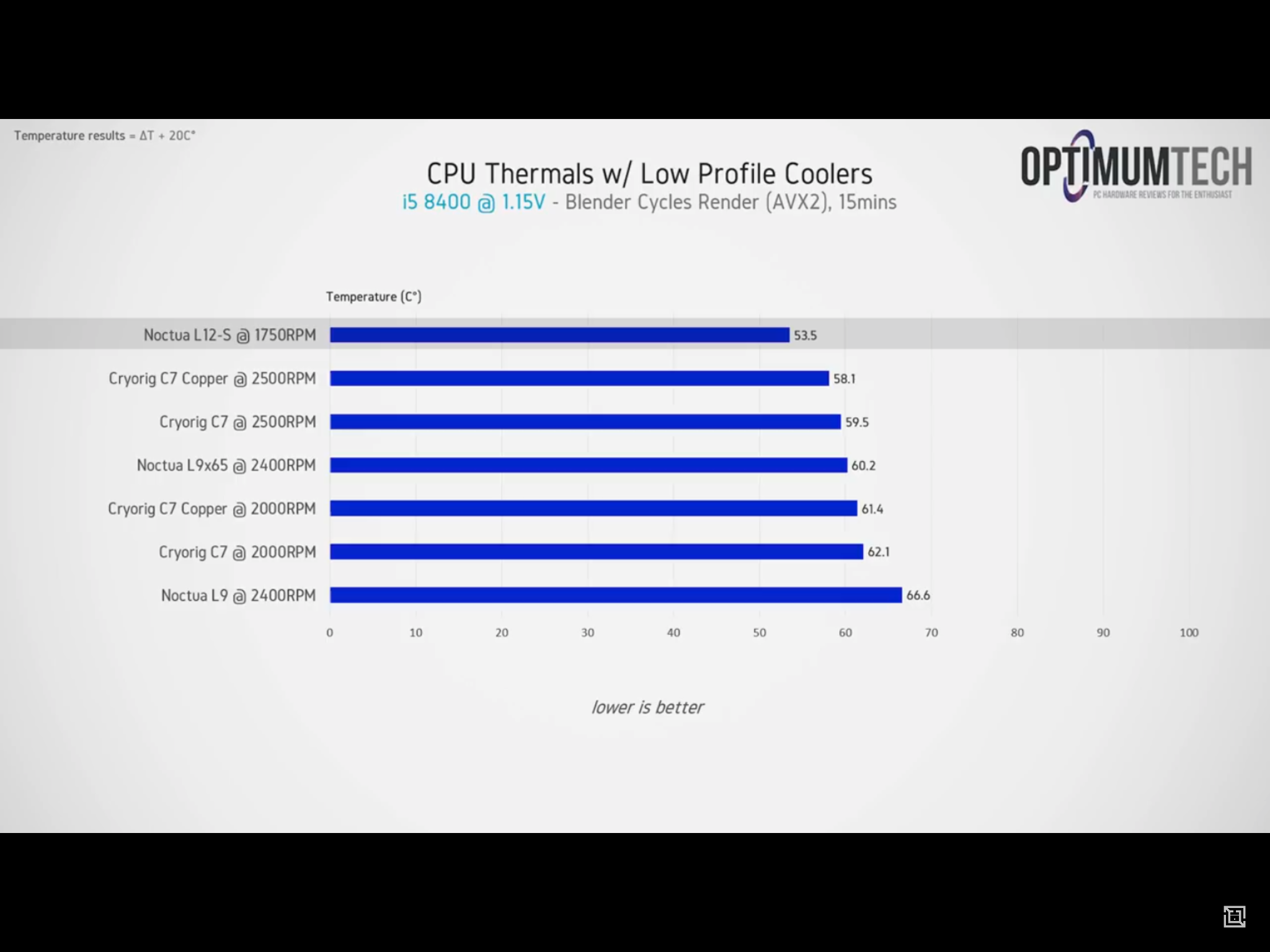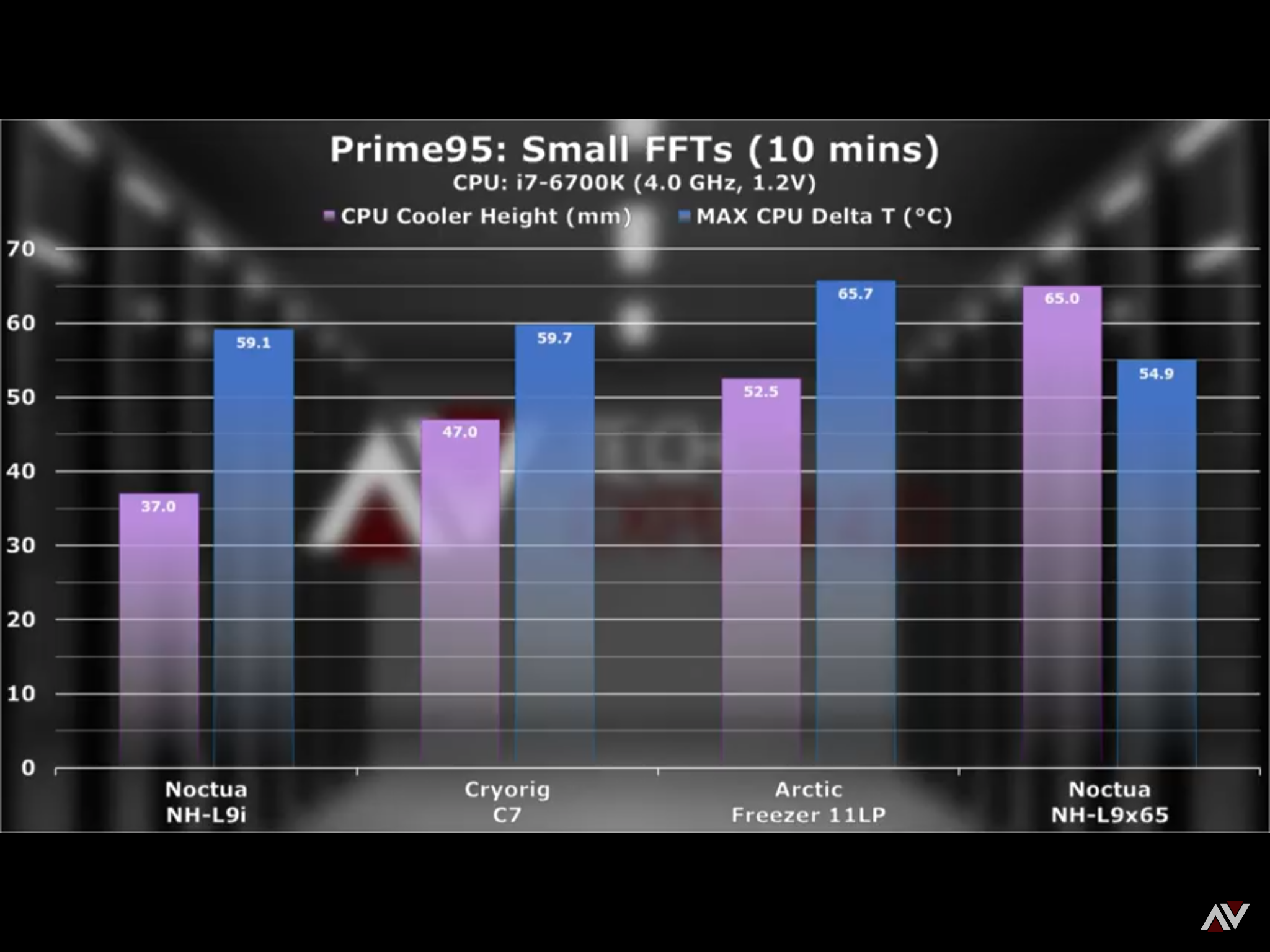 Ожидаемые цифры, но на мой взгляд все еще большие - сказывается небольшая (но все же больше площади радиаторов N9i). Разумеется лучше всего поставить Ноктуовский вентилятор - несмотря на меньшее количество оборотов, он через себя пропускает больший поток воздуха.