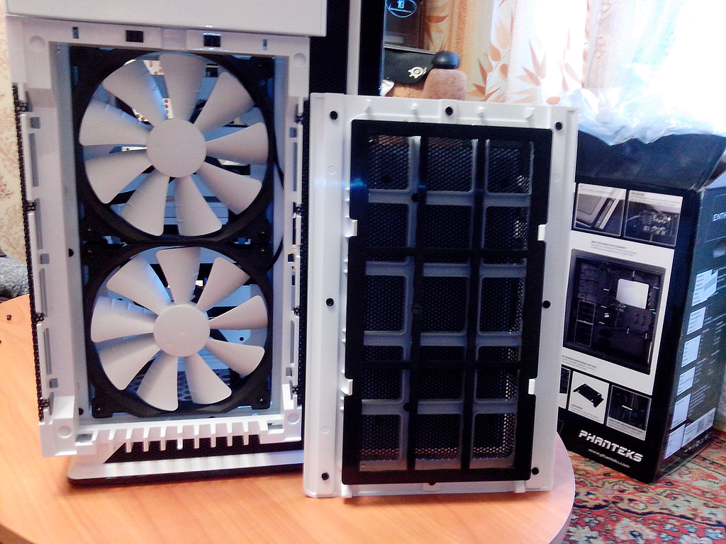 Правая боковая панель. Слева магнитный пылевой фильтр для блока питания, справа съемная заглушка. Сняв её, туда можно прикрутить рамку для крепления 240мм радиатора.
