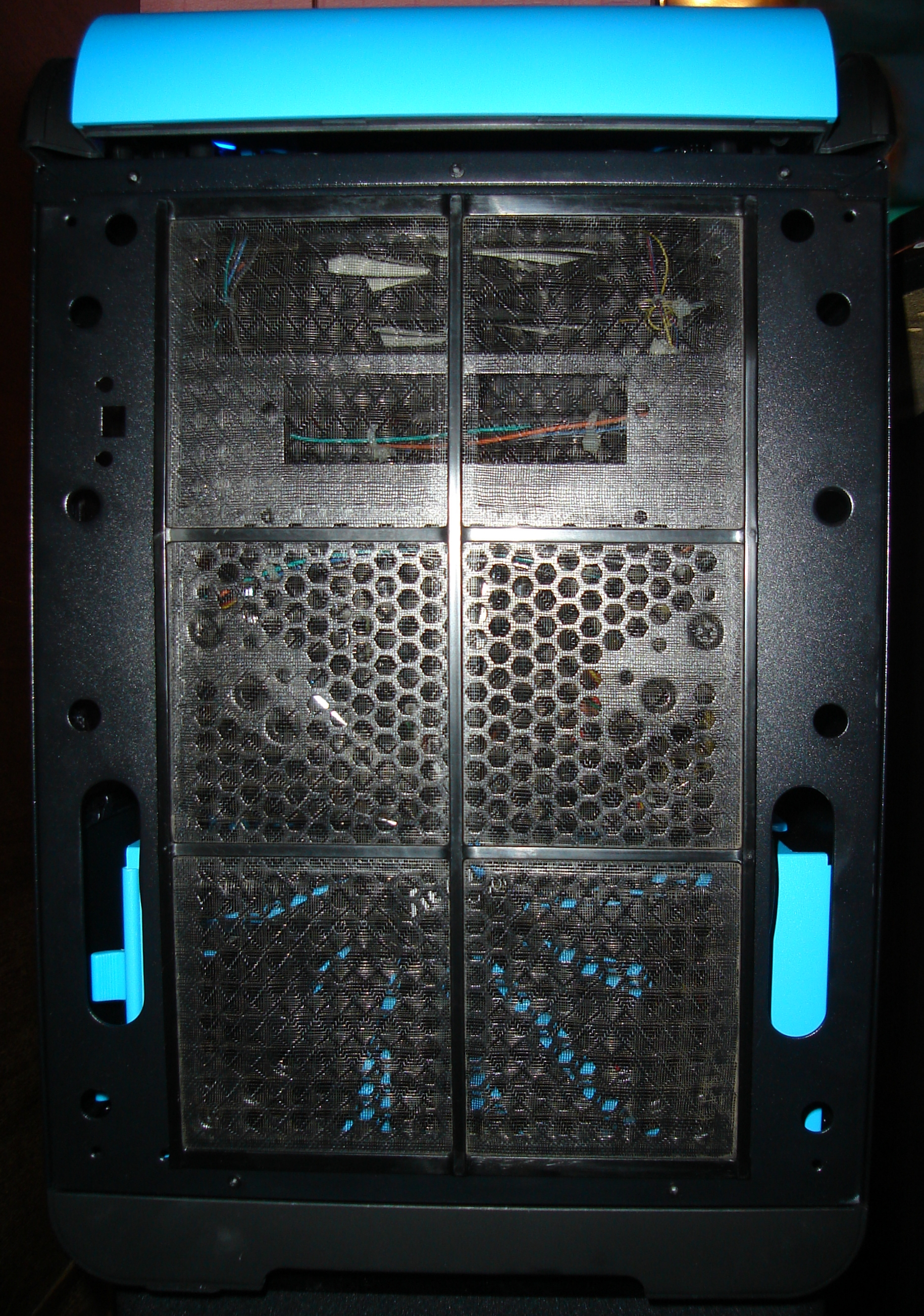 Всем хорош мой AeroCool Dead Silence Cube Blue Window Edition, но всё же есть один маленький недостаток – нет противопылевого фильтра на переднем 200мм вентиляторе. Иженеры AeroCoo, я думаю, всё же кумекали насчёт фильтра, так как в металле передней панели мы видим лишние отверстия.