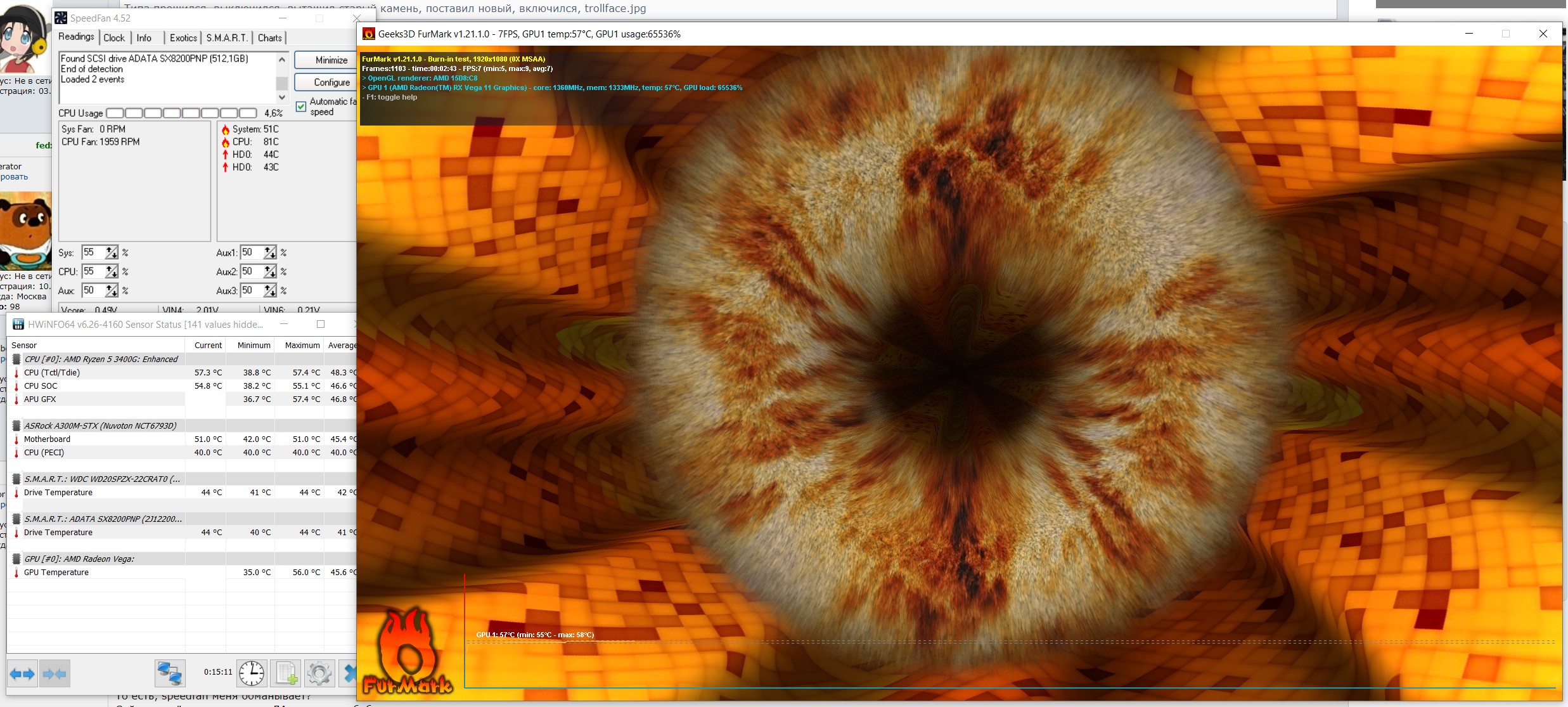 Это что же получается, спидфан меня обманывал, всё это время? Рукалицо, просто! 60 градусов, под такой нагрузкой, вполне норм, ящитаю. Пойду включу обратно буст, и всё остальное. Попробую на полной мощи.