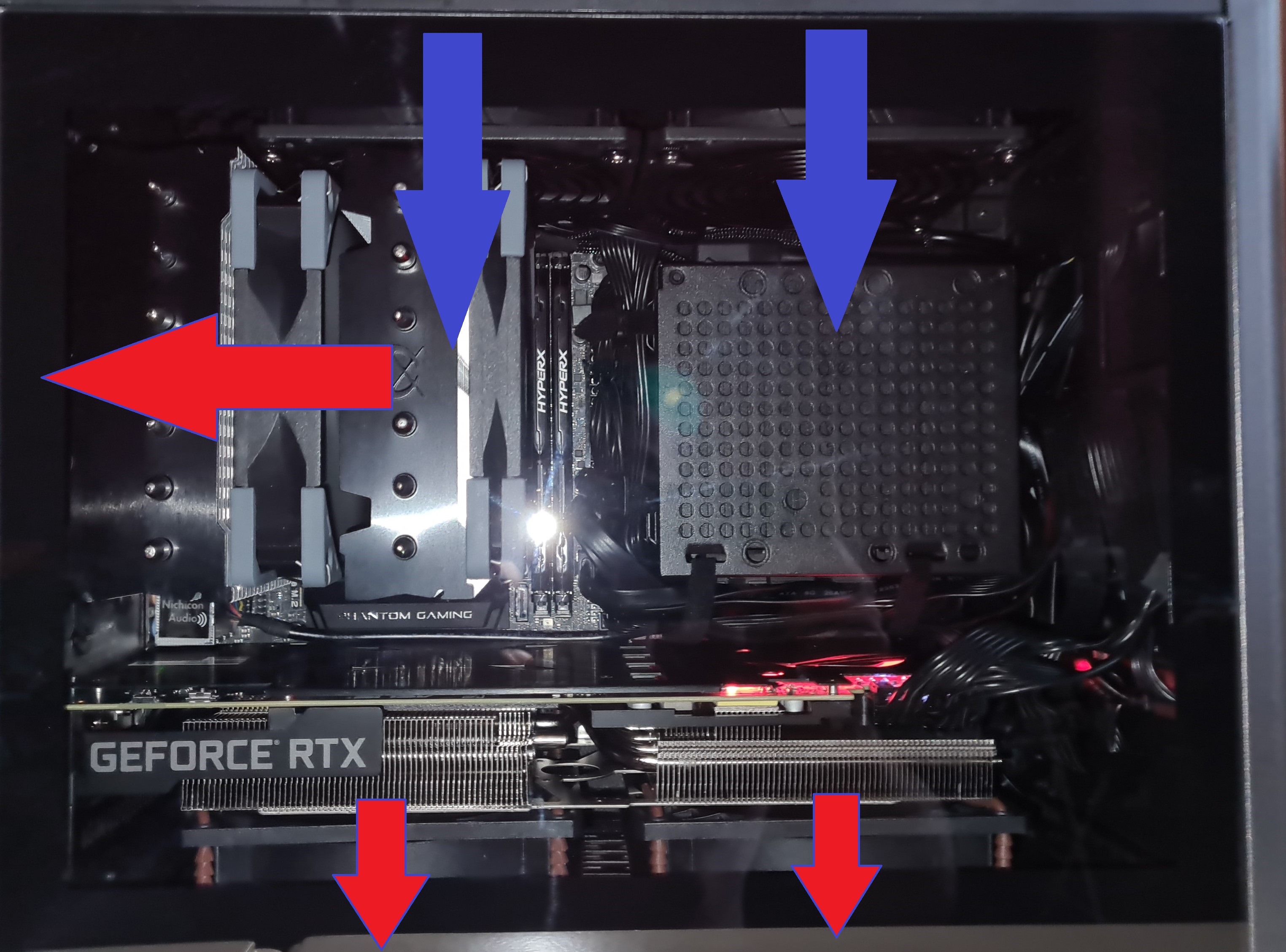 Снял кожух с видеокарты и поставил 2xP12 на выдув вниз. Стоковые от CM на вдув сверху и Фума выбрасывает за корпус.
