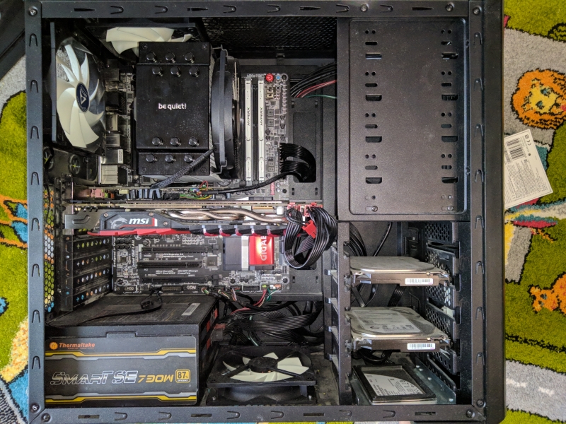 Как видите, пыли набралось много, а все из-за дырявой боковой стенки. Было решено сменить корпус. Требования были следующими: пылевые фильтры, хороший обдув, USB 3.0 спереди и компактность. Всякая подсветка мне была не нужна, да и наличие вентиляторов не было необходимостью. В итоге что получилось в итоге: