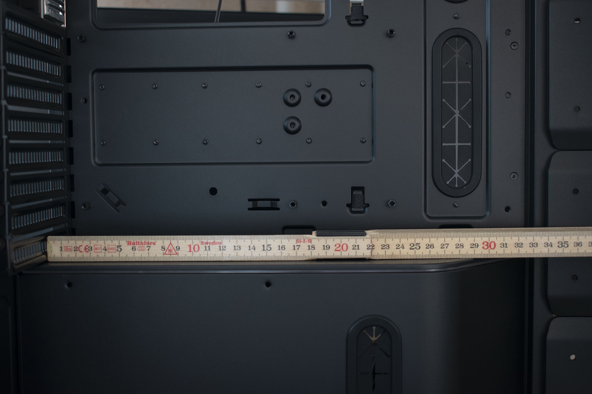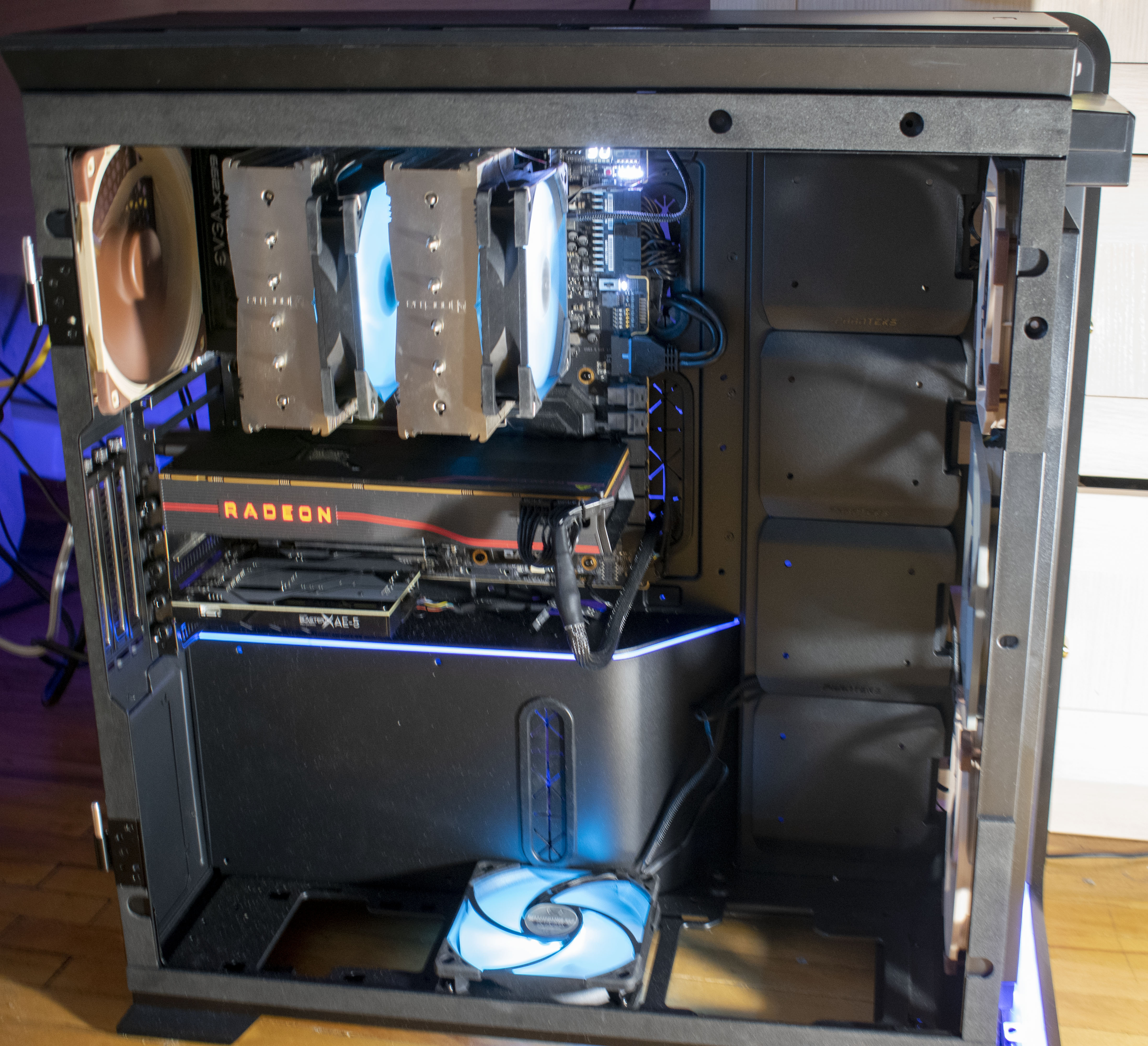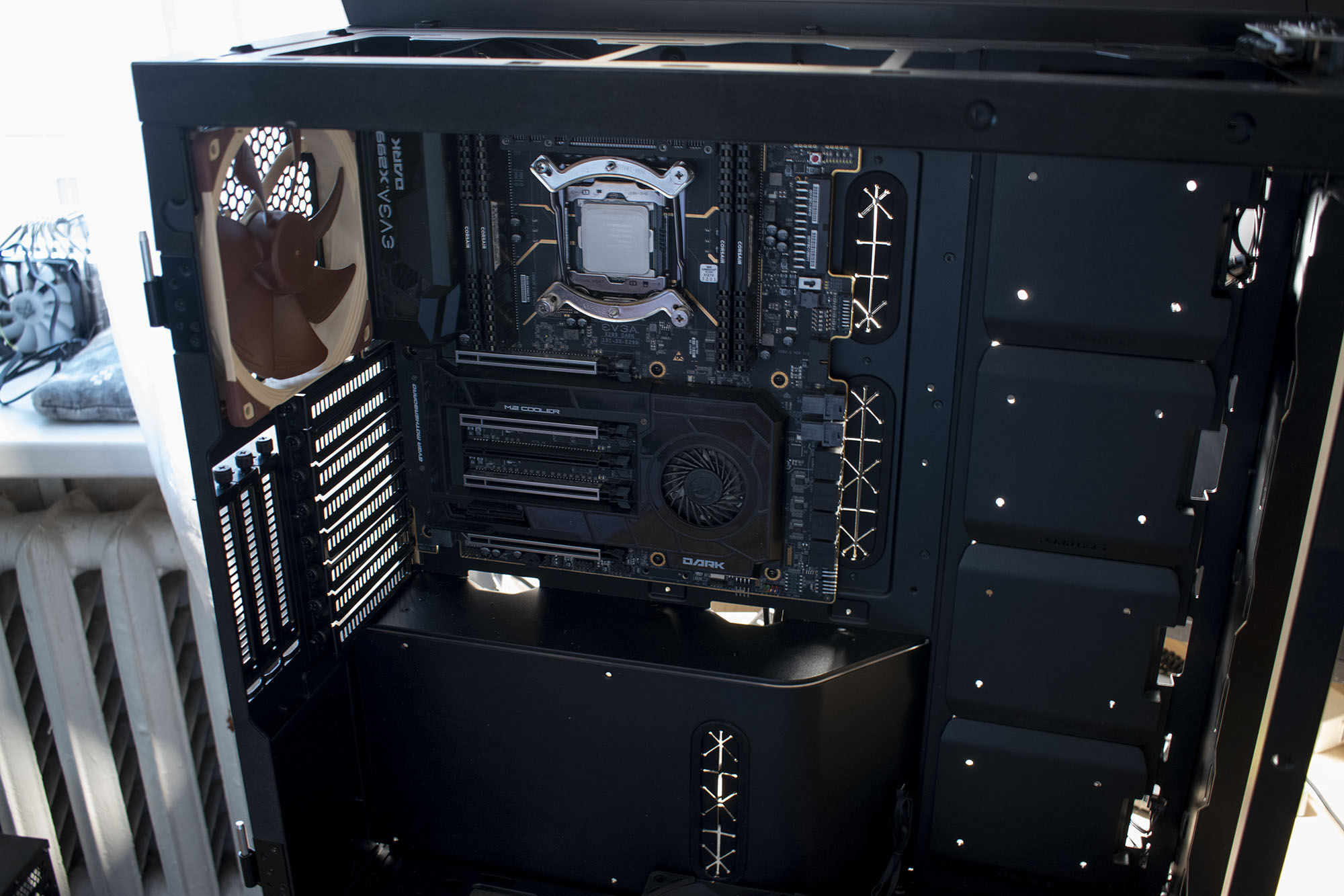 Нюансы, которые желательно знать до покупки/установки комплектующих: - Для крепления SSD на боковые латки / боковую перекладину нужно иметь полностью плоские штекеры для SATA питания, например, кабель от Corsair HX850i не подходит совсем. - Нужно иметь два 20 пиновых разъема USB 3.0 + мелкий USB 3.1 для подключения всех USB разъемов с передней панели. У меня кстати не хватило одного 3.0, подключал через переходник в 2.0 хаб, так что потерял часть функционала, но не критично. - Высота поддерживаемых кулеров 167мм и это действительно так! Dark Rock Pro 4 (164мм) влез с запасом в пару миллиметров всего.