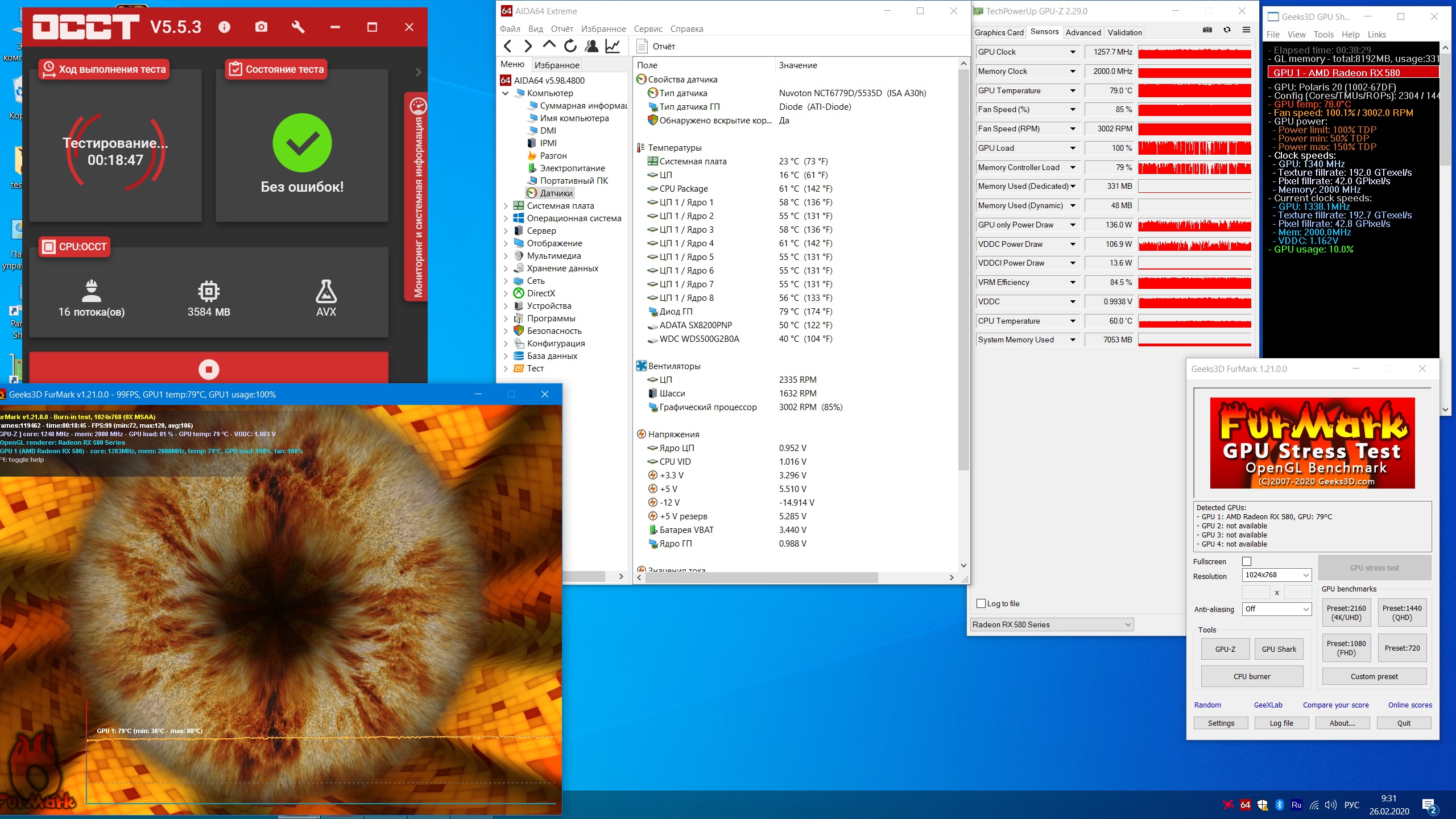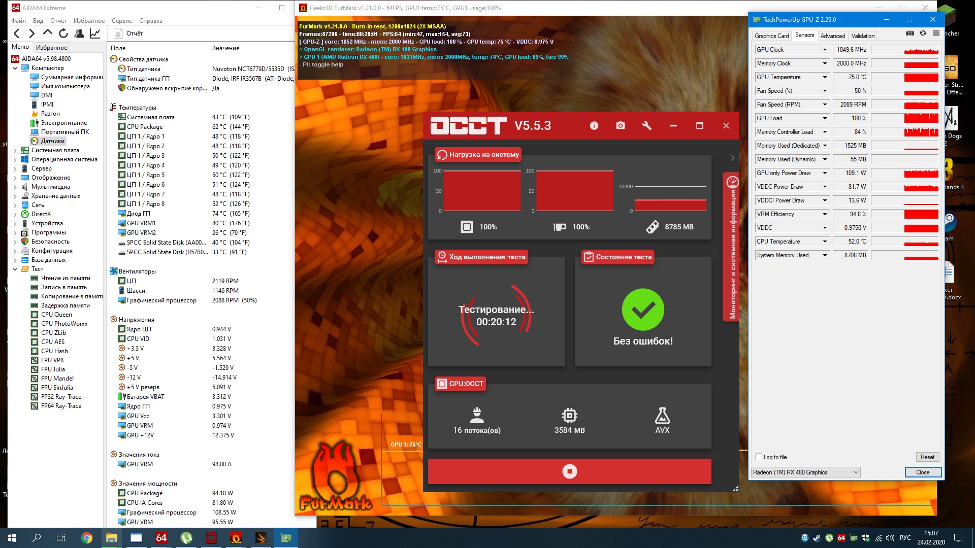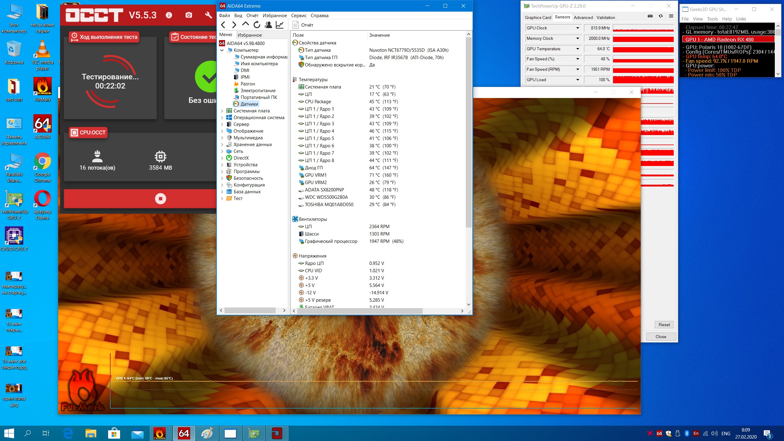 и для сравнения корпус matrexx 70 2.внутренности -СВО на 360 на верхней панели, на ней 3 вентилятора на выдув , на фронтальной три вентилятора на вдув и один сзади, все вентиляторы одинаковые AIGO(ргбшные) 120 мм, режимов два слышно и не слышно,какая там скорость фик знает, у них свои разъемы, не подключить к материнке и не выяснить, все стенки закрыты xeon e5-2650v2,с тем же RX480 и разогнанная память 4 плашки, но она не греется так как на первом компе тоже два скрина 20 минут кулеры в режиме тихо и 20 минут кулеры в режиме громко