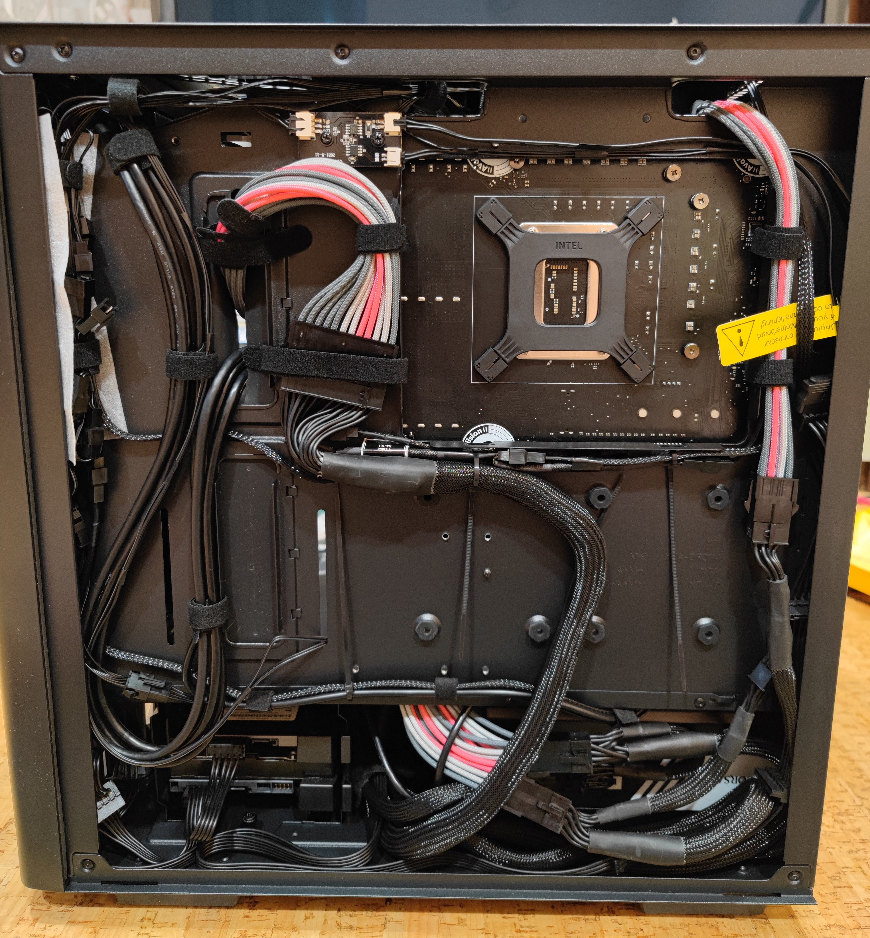 Теперь о минусах, и о том, что я бы доработал и получил почти идеальный недорогой корпус: - суть увеличил в продольном размере Под 3080ти и выше - размера очень мало, пуш-пулл спереди НЕ сделать, при длине карта около 32-33 см, будет упираться. - тооонкий металл, пустой корпус можно поднять одним пальчиком, шасси играет, поддон играет, правая крышка играет, очень обидно. правую крышку буду закатывать в шумку. Передняя съемная панель прогибается легко, но деформации не остается, отыгрывает обратно сразу же. Места крепления фронтальный фенов гнется просто легчайше - хорошо слышно классический ХДД в корзине, из-за плотного контакта салазок и тонкого металла, резонанса на шасси нет, но звучит довольно громко. - таки маловато места за поддоном - все место в ширину досталось основному отсеку, 175 мм топовые башни влезут со свистом. - наложили фенов, видимо, просто чтобы были. Из 3-х фронтальных два имеют шум мотора, поток слабый, на полных 1100-1200 н так, чтобы шумны, но не тихие. Тыловой с шумом мотора. Все фены с призвуком завихрения потока. - на верхней крышке отверстия рядом с местом крепления фенов сделано зря - будет просто обратный захват воздуха снаружи. По уму - надо закрывать. - нет рамки крепления БП, а вставлять БП с пристегнутыми проводами - непросто. Но этого нет и у моего Лиан Ли за много денег. - еще раз про продольный размер: с RM750i (да, относительно длинный он) корзину пришлось сдвигать вперед, а со сдвинутой оной на фронт установить 360 - никак. Хотя с длинной ВК в корпуса такого типа моя личная рекомендация - ставить 240-280 - тогда горячий воздух выдувается НАД ВК, и сразу выносится верхними вертухами. Да, чуть будет бить в торец ВК, все-таки корпус компактный, но так, как с 360, где нижние 120 мм задувают тепло прямиком на захват ВК. - хотелось бы резинки и на прорезях на кожухе БП, возможно, добавить прорезь для проводов ВК ближе к стеклу, а не у самого поддона. - исходя их предыдущего пункта корпус хорошо бы чуть увеличить в высоту, и сместить мать вниз - 240 -280 будут ровно над линией ВК. Но, если бы у бабушки был.... то это был бы другой корпус