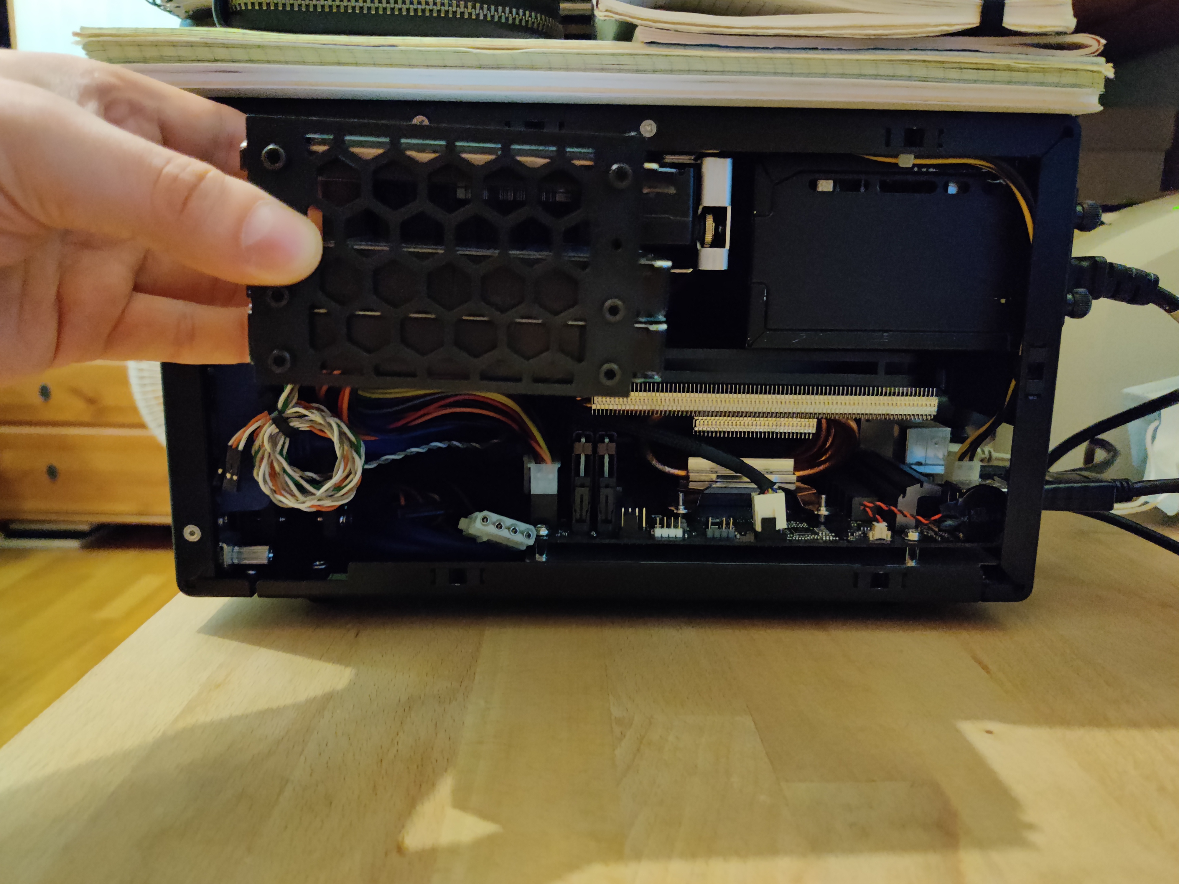 Мыша Это мой файловый сервер-второй комп-медиа проигрыватель для гостиной. Сейчас комплектация такая: Процессор: APU AMD Ryzen 3 4350G Материнка: ASROCK B550M-ITX/AC Оперативная память: DDR4 2*8GB@3600 XMP SSD NVME: INTEL 760p 256GB - OC SSD SATA: Vertex 4 128GB - Page File HDD: WD 3.5" WD20EZRZ 2TB (помойка всяких файлов, стоял внтури, сейчас будет подключен как внешний через док станцию) HDD: Seagate 2.5" ST4000LM024 2*4TB (зеркало) HDD: WD 2.5" WD20SPZX 4*2TB (2 зеркала) Блок питания: FSP FSP300-60GHS 300W Корпус: LIAN LI PC-Q16B