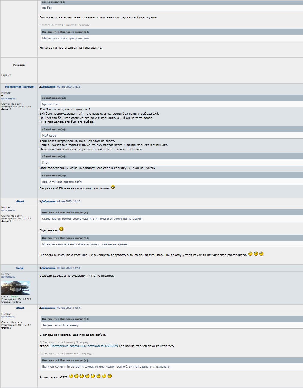 Объясняю на пальцах. Не употреблял слово "дрель" и никогда не называл отверстия "дырками", о чём давно упомянал ТУТ. Поэтому все мои рекомендации легко находятся ключевыми словами "насверлить отверстий". В потоках их было 4. Из них, до января 2020 всего одна, она касалась Evolv X. Корпус замечательный за исключением 1 косяка - передняя панель глухая, что сводит на нет всю задумку инженеров Phanteks. Из сообщений xyligano от 20.07.2019. и 03.08.2019. взял на вооружение, что корпус можно довести до ума 2-мя путями: заказать Front Cover Air Flow Mod - панель за 80$ ТУТ (их 7 видов) или самому насверлить отверстий. Разумеется, челу был предложен бесплатный вариант. Некоторыми деятелями, типа тебя, предложение было воспринято в штыки, мол "в топовом корпусе сверлить дырки - хороший совет". Слово "дрель" не упоминалось, откуда оно взялось в твоей пустой башке, мне неизвестно. Никто ту переписку не чистил, все сообщения следуют друг за другом чинно и пристойно. Если у тебя хреновая память и/или нет пруфов, никогда не пиши на людей напраслину. Надеюсь, до тебя дойдёт, что ты облажался. Впредь, следи за своим языком и прежде, чем что-то брякнуть, 7 раз подумай.
