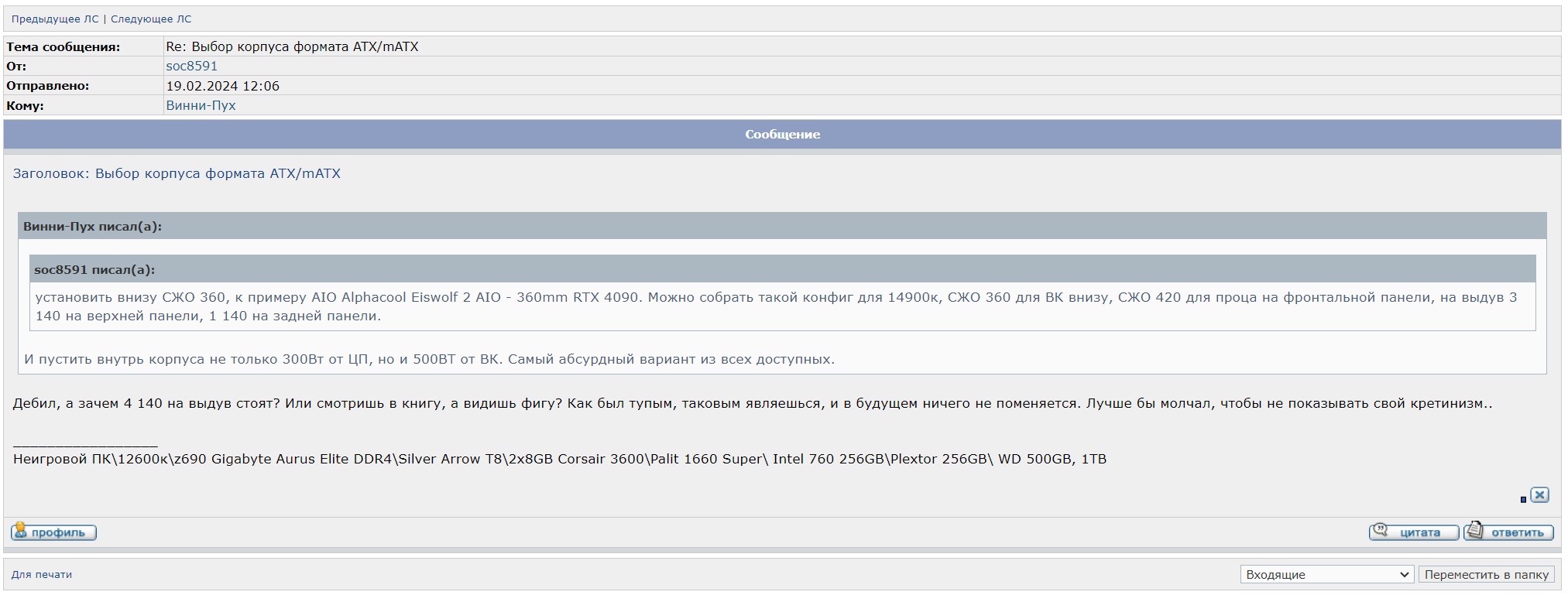 Конечно не аналог. Ведь в ENTHOO PRO 2 TG имеется возможность установить внизу СЖО 360, к примеру AIO Alphacool Eiswolf 2 AIO - 360mm RTX 4090. Можно собрать такой конфиг для 14900к, СЖО 360 для ВК внизу, СЖО 420 для проца на фронтальной панели, на выдув 3 140 на верхней панели, 1 140 на задней панели. Твой раритет был хорош 30 лет назад, а сегодня обычная, ни чем не примечательная коробка. А том какой из тебя сборщик ПК говорит твой скрин. Вполне сойдет для образца, как не надо собирать систему.