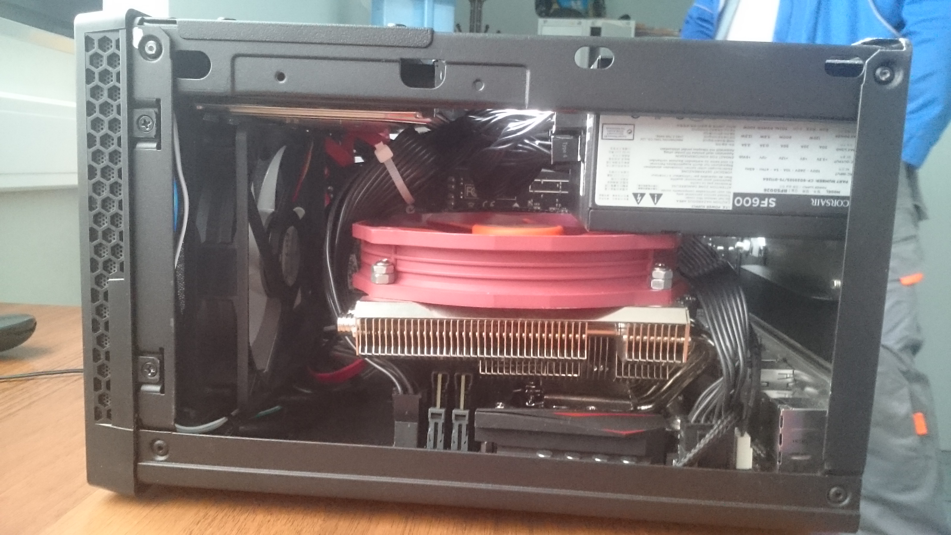 Привет камрады. Собрал себе мини пк, как замену игровому ноуту msi gt 70. Корпус Silverstone sg13, 6700k(скальп), ram 16Gb hyperx fury, z170i pro gaming, блок corsair sf600, видео gtx 680 ref, кулер спереди 120мм(2000 об) Хочу поделиться полученным опытом. Проблем со сборкой не возникло. Есть пару моментов. Стоит блок питания sfx. Переходник atx->sfx пришлось вырезать самому. Охлад на проце - Thermalright axp-200r(закрывает доступ к оперативке), встал идеально. Но, через пару дней затрещал кулер(высота 13мм). Позвонил оф. дилеру Thermalright, заменили на более оборотистый TY 143(высота 25мм). Встал тютелька в тютельку с блоком. Итого в этот корпус с блоком sfx можно ставить охлад высотой до 85мм. Температуры: 6700k сток в linx- макс 55 градусов. Мать 25-30. Вообщем корпусом доволен. Таскаю с собой на работу в рюкзаке. Может кому пригодиться.