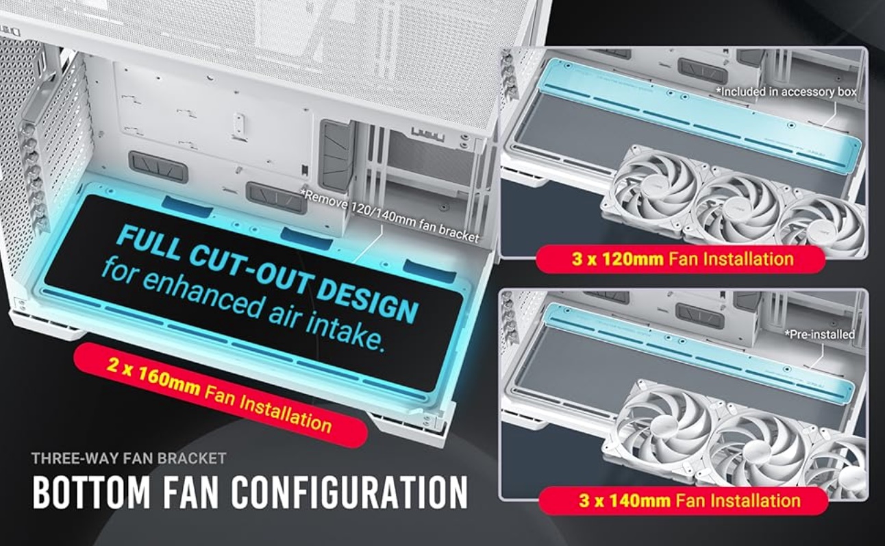 Дополнительный воздухозабор, который осуществляется через специальные окна, расположенные в нижней и боковых частях некоторых корпусов, позволяет увеличить поступление холодного воздуха для систем охлаждения видеокарт и процессоров.