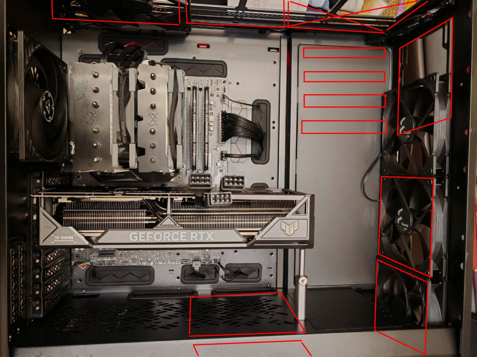 Вводные: 1) Нужно, чтобы вместилась 4080 RTX Suprim X (34 см) с запасом. 2) Нужно, чтобы вместилась на потолке NZXT X73 (ОЧЕНЬ толстый радиатор, вместе с кулерами - не менее 55-60 см в толщину).
