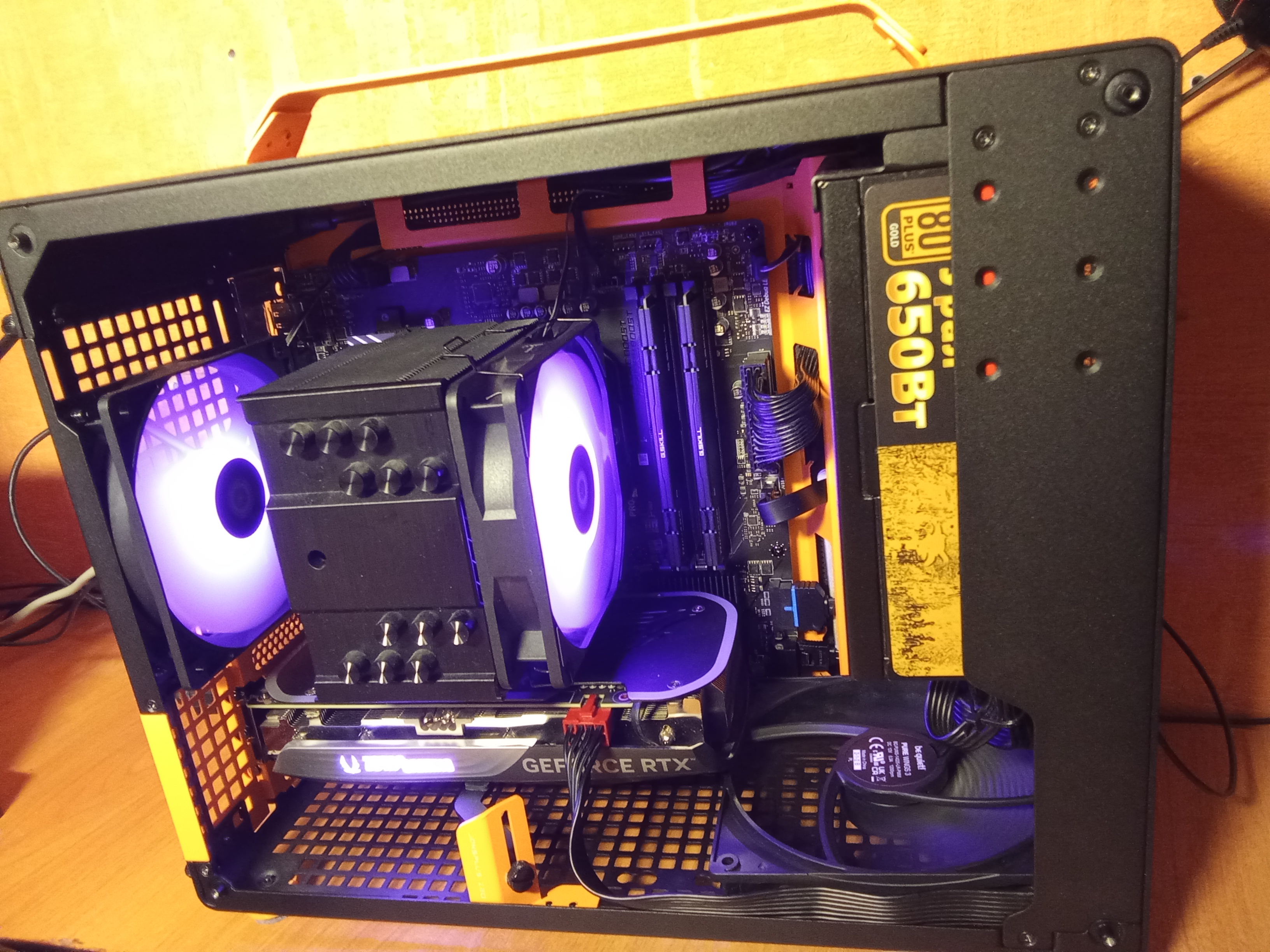 Относительно нормально. Карта сама прекрасно тянет воздух снизу, температуры до 70. Для зотака в таком исполнении это более чем хорошо. Проц в синебенч R23 с пакетом 90 ватт прогревается до 65 градусов, в играх видел и 80+. 140-ка снизу чтоб создать давление для исключения пылесбора, т.к. каких-то значительных улучшений от ее присутствия не заметил. Как и от вытяжных сверху, поэтому ставить не стал. Сетап то с не сильной теплоотдачей, поэтому все норм. Корпус реально милашка...все очень хорошо и точно подогнано. Будто премиум класс в 2-3x дороже. единственное я обосрался с вентилями, хотел чтоб было в одном фоне с оранжевым оформлением, а вентили умеют только в выбор из нескольких фиксированных цветов (трехпиновый разъем подсветки)