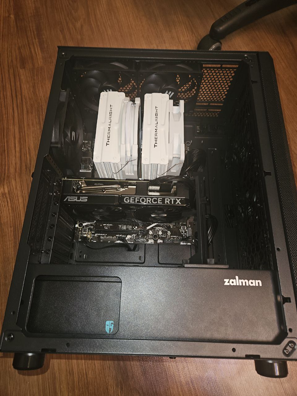 нет ни HDD, ни sata SSD (и наверняка не планируется?). "окно" в коробе для кабеля 12VHPWR самостоятельно резали? и разъем 20pin (USB3) в МВ немного отгибает, может зря стяжкой связали с 24pin на МВ, или может "юсбишный" кабель чуть внутрь подтянуть чтобы не изгибало в разъеме? лучше пусть торчит "петлей", чем недоконтакт в разъеме.