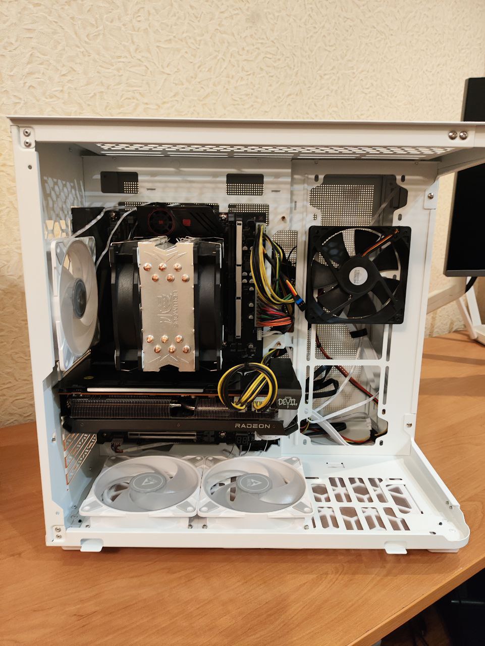 В общем взял таки его. Вроди неплохой корпус. Но дошло дело до установки кулеров, взял такие по совету из ветки выбора кулеров https://www.wildberries.ru/catalog/64784787/detail.aspx. Но я уже лет 15 не делал сборки, отстал) Погуглил, пишут нужно ставит один сзади на выдув, а сперереди или сбоку на вдув. Короче поставил один на выдув, а на вдув спереди то их нужно задом на перед получается, что не эстетично для подсветки. Остальные два поставил снизу тоже на выдув На старом корпусе был один черный кулер без подсветки, временно его и посавил на вдув задом на перед. Подскажите, мне нужновзять еще три реверсных на вдув, правильно понимаю?