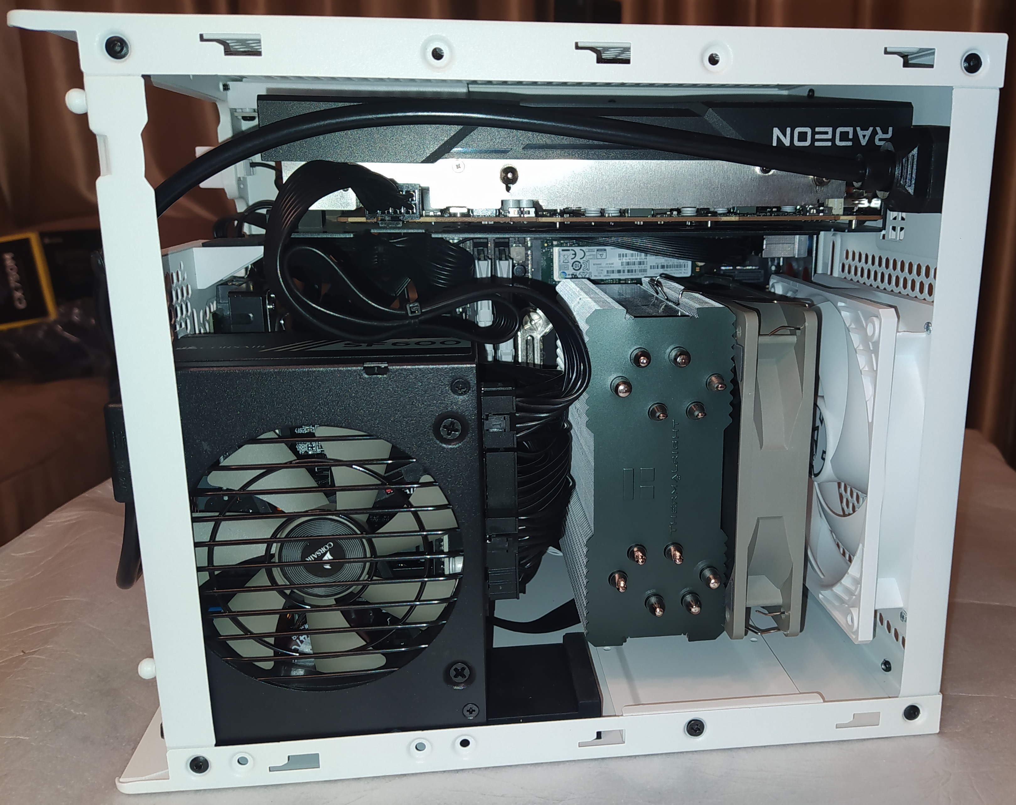 Конфа такая: i5-12400F. Оптимальный проц по соотношению цена/температура/производительность. Maxsun Challenger H610ITX 2.5G. Отдельно спасибо камраду Cider, помог определиться с МП. Отличная вещь, по питальнику лучше чем бюджетные Asrock, ASUS и прочие. При этом дешевле. Рамка на сокет Thermalright. Ставил такой девайс первый раз, однозначно буду использовать во всех сборках, помимо очевидных плюсов - чисто эстетически намного приятнее стока выглядит. Кулер Thermalright Burst Assassin. Отличный кулер за свои деньги, пожалуй даже чутка оверкилл для данной сборки, но запас карман не тянет. Память Crucial Ballistix 2x16 3200MHz Модуль WiFi AX210 Вроде как лучшее что можно поставить на данный момент, завелась кстати без проблем. У МП в комплекте есть крепеж. SSD Samsung PM981 HDD WD Blue 4TB. Весьма тихий HDD. Видео Powercolor Hellhound RX6600XT. Б.у. с Авито. БП Corsair SF600. В представлении не нуждается, надежный проверенный SFX БП. Вентилятор на выдув Arctic P12 White.