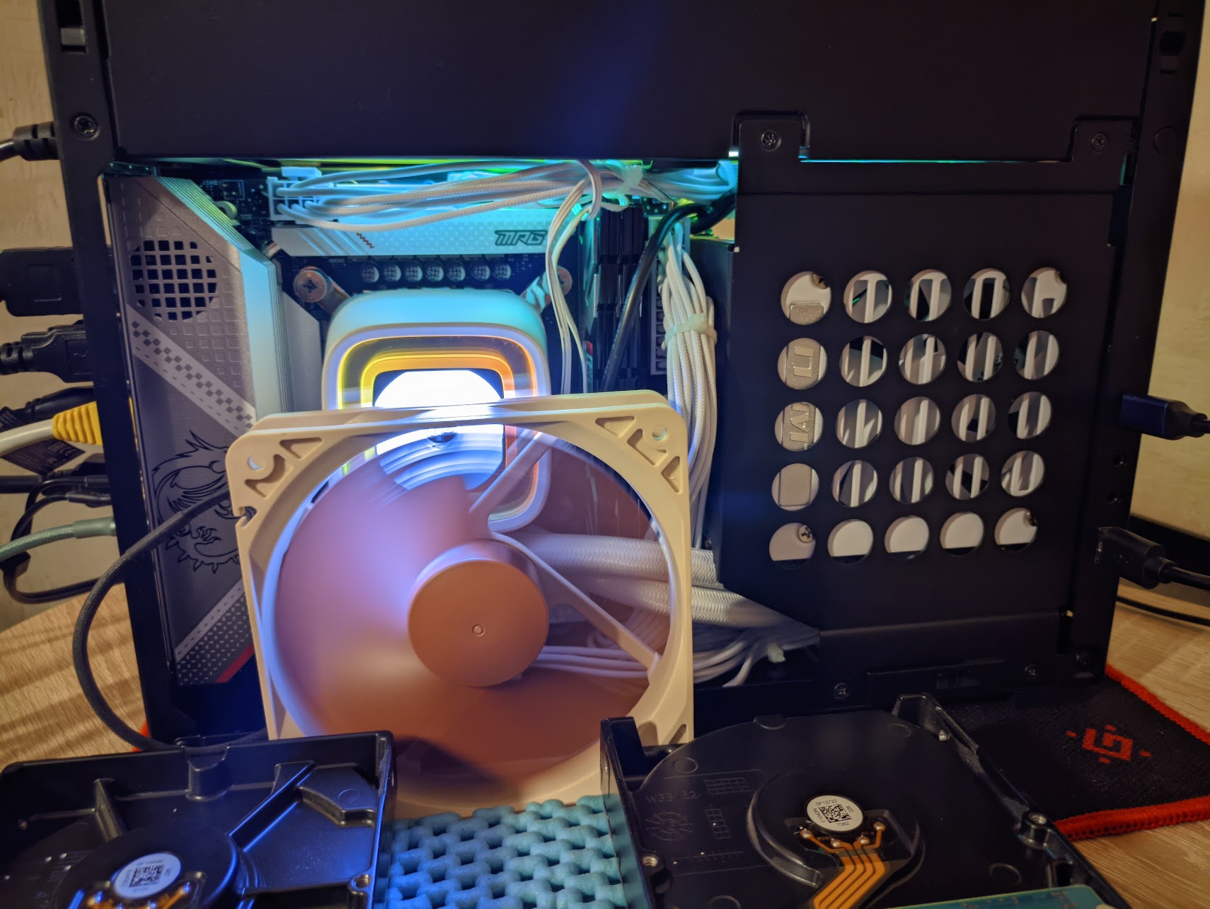 ATI I была такая идея, но во-первых сетка не то что бы крупная, поток воздуха будет достаточно плачевный. Ещё я думал положить пару вентиляторов тупо под корпус, на какие-нибудь проставки, чтобы дули в отверстия снизу. Но потом сказал себе: "воу-воу, так, стоп". Ведь вся суть SFF сборок - в эстетике. А тут мы подкладываем вентили, с одной стороны корпуса силиконовые гвозди втыкаем, другая стенка вообще снята, ещё до кучи комнатный вентилятор в неё направим для обдува. Ну, блин, смысла во всём этом нету Проще либо собирать в ITX ультра-холодное железо (грубо говоря 12400 с воздушным охладом, который бы обдувал всё вокруг, DDR5 в стоке 4800 на низком напряге, Sata SSD вместо NVME), а для мощного железа лучше взять продуваемый корпус покрупнее. И будет там пусть и другая, не компактная, но тоже эстетика.
