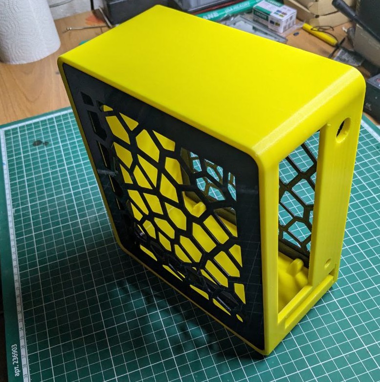 ivanvatnikov по cooj. Здесь отмечался реальный владелец, только версия вроде под apu у него была. Запомнил потому что эта тема с боковыми крышками на магнитах очень понравилась. А вот использование flex блока не очень. В итоге пробовал печатать модель со стенками под использование неодимовых магнитов 5*2. Пластик уводит сильно, нужно места под ножки делать и за счет них устранять неровность основания, ну вентотверстия на дне корпуса для использования платы расширения типа видюхи обязательны. В базе крепление матплаты по другому бы реализовал. У меня еще и пика pico box z4 банально не влезла. В итоге начал менять, но только длину модельки на +9мм увеличил... а потом... забил на это. Файлы stl, если кому нужно, добавил.