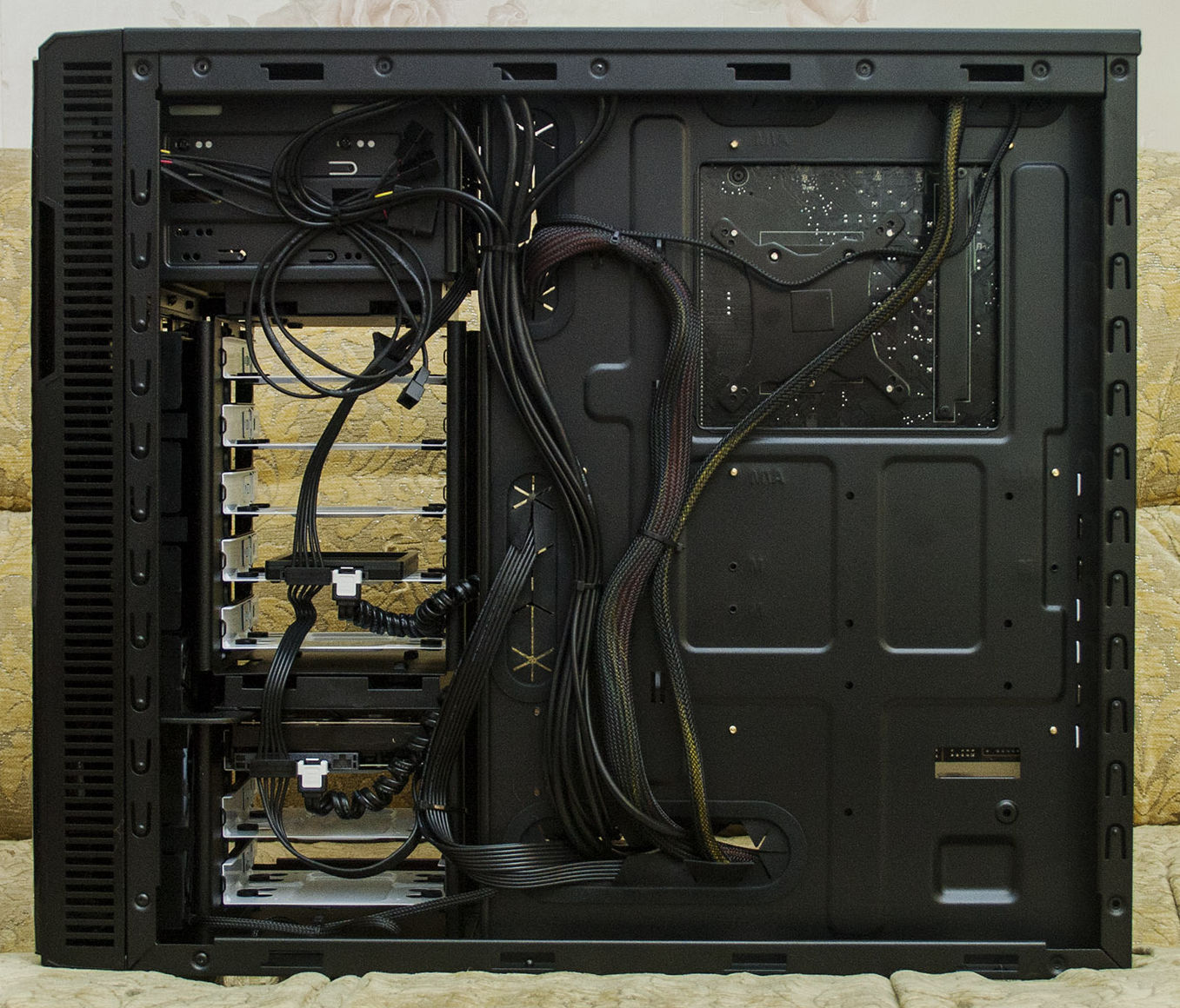Мой вариант кабельменеджмента. Не столь аккуратно, но я делал на расчёт быстрой замены или добавления комплектующих плюс не люблю сильно стягивать/растягивать/напрягать провода (да и некоторые разъёмы на матери, порой, боюсь, что отломятся от напряжения). Комп другу собирал.