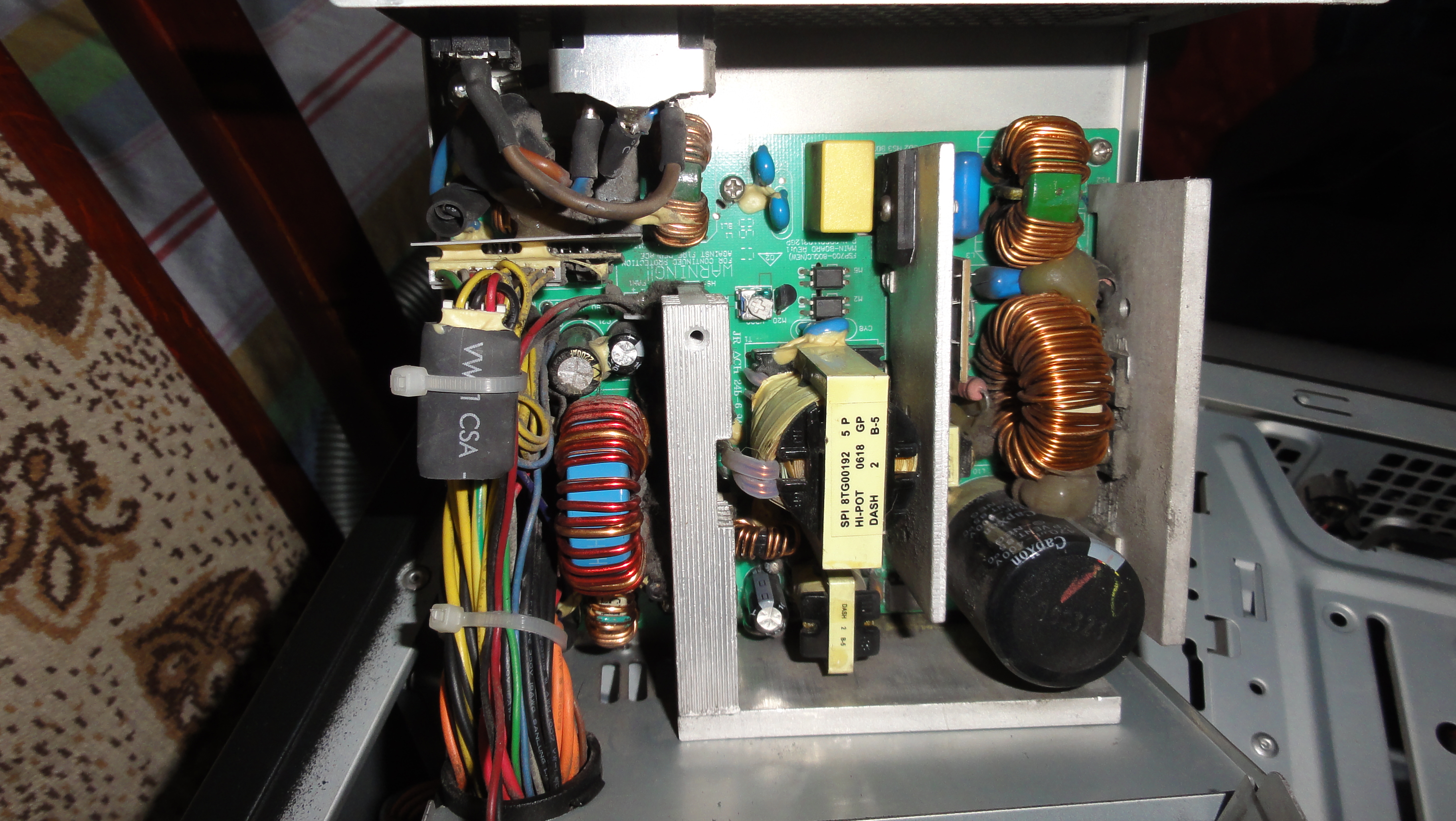 BBwolf, в 2008 году, он стоил в Риге, 60лвл(лат) с чем то, что на тот момент по курсу $ было около ~120$. Курс тогда был 45-49 сантим за 1$. 1лат= 100 сантим. Сейчас у нас валюта в евро. Leviafan, до этого на этом БП, висела видюха HD3870 (oc) cдохла. GTX 560ti (oc) также cдохла. Обе прожили по 3 года где то. Вскрыл БП, фото ниже. Вроде вздутых конденсаторов нет. Подключал 1 провод 8 пин, и переходник 8 пин с 2 линий.