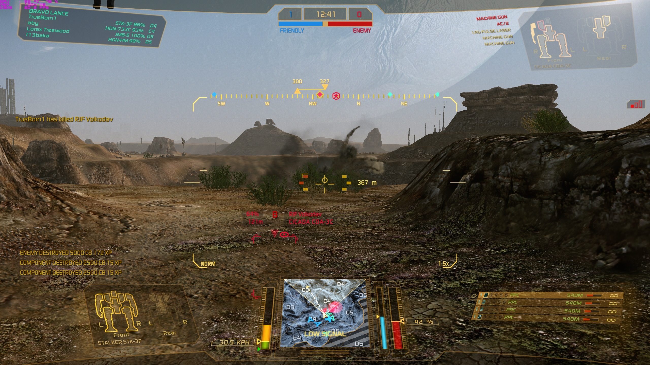 Артиллерия за C-bills + модуль за 15.000 GXP (для задротов ) - стоит 40.000 СВ - падает 10 бомб с дамагом 10 и сплэш дамаг снижающийся до 0 в радиусе 10м от взрыва. - между вызовом и падением первой бомбы проходит 6.5 секунд - бомбы падают рандомно в радиусе 50м от точки вызова.