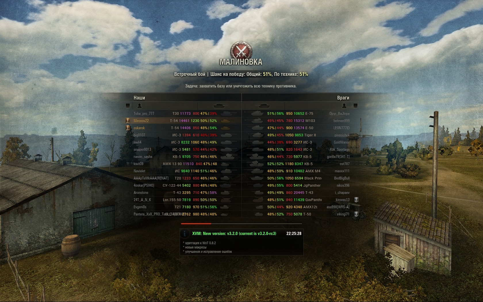AlarmZone13: http://yadi.sk/d/Pr4P9Fw77IB-K (собиралась для версии 0.8.7) Состав сборки: - Полная поддержка XVM, с возможностью показа шанса на победу до боя и в последствии во время боя - Удобные и информативные прицелы, с отображением уровня брони - Углы горизонтальной наводки - Удаление черноты в снайперсом режиме - Информационная панель о выбранной цели - Стандартная Damage Panel с расширенным функционалом - Удаление камеры - 7х кратное увеличение в снайперском режиме - Цветные ж/д платформы - Стрельба по перезарядке с зажатой кнопки мышки - Расширенная боевая статистика игрока - Вертикальное дерево развития - Альтернативные маркеры техники - Информационная мини-карта с указателем и с последним засветом - Детальный лог личного урона - Мод цветных сообщений + Итого за бой + Статистика за сессию - Альтернативная информаци действий в игре - Отображение Ping в игре - Альтернативный игровой интерфейс - Альтернативный ангар - Альтернативная озвучка и игровые звуки, Атмосферная озвучка от Strategic Music и Historical Realism Gun Sounds Mod - Цветные маркеры попадания - Белые уничтоженные танки - Лог урона - Альтернативные иконки танков во время боя - Полный набор клановых иконок - Часы в ангаре и в бою - Альтернативные картины, при входе в игру - Настраиваемое боевое меню "Ромашка" для World of Tanks - Отображение НР в ушах - Эффект улетающей души уничтоженного танка и бумажные самолётики в место птиц - Расширенные подсказки к умениям и навыкам экипажа, наград и достижений и т.д. Околоигровые программы: - WoT Tweaker, для выключения не нужных эффектов в игре - Библиотека Dokan, для работы XVM - Проверка Ping Оптимизаторы: - AMDFusion for Game, для видео карт AMD - Puran Gaming PC - Wise Game Booster - Razer Game Booster P.S. Шкурки на танках не входят в сборку. Внимание! Сборка проверена антивирусами COMODO Internet Security Premium и Emsisoft Anti-Malware. Вирусов нету! P.S. Многие мод-паки делаются под себя, по этому кому-то понравится моя сборка, кому-то нет. По этому не надо ругать меня, мол это лишнее, это так-сяк и т.д.)