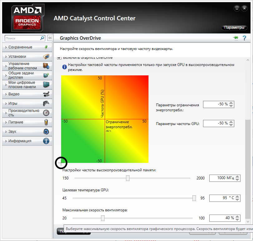 В драйверах есть вкладка "Производительность". MSI Afterburner не совместим с радеонами и каталистами, об этом говорил ещё сам разработчик программы ещё с того времени как она называлась RivaTuner