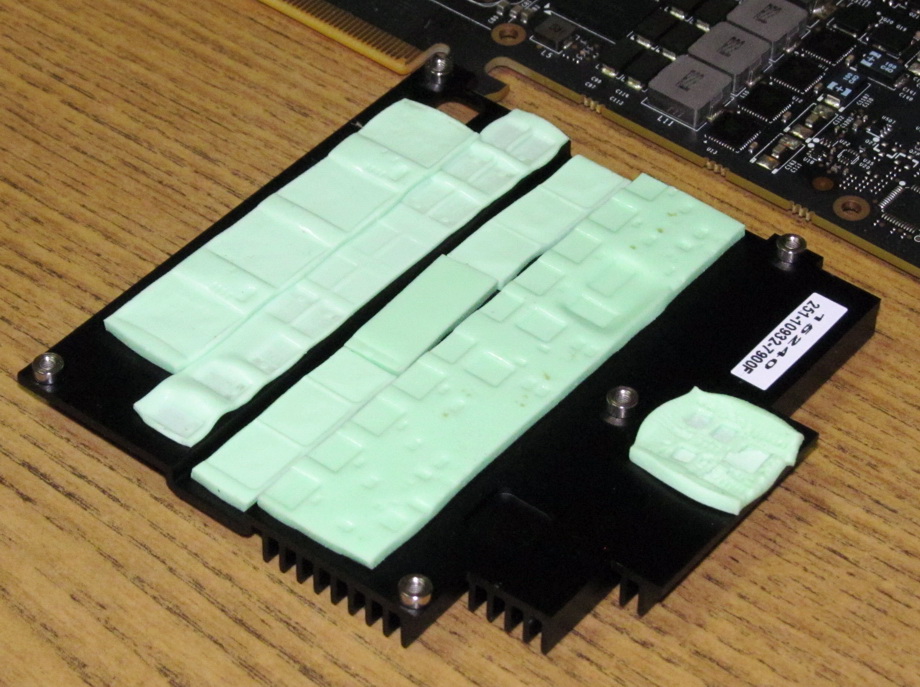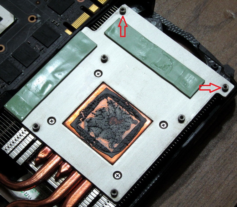 Хороший такой, основательный охлад, и - из восьми микросхем памяти под основным радиатором нормально контактирует с термопрокладкой только одна. Не в последнюю очередь из-за того, что винты в указанных стрелками стойках оказались самым пошлым и банальным образом недозатянуты.
