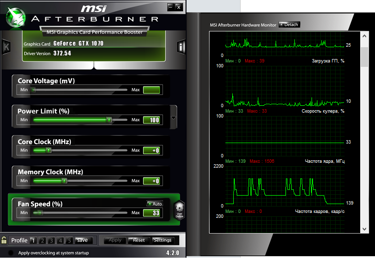 Всю ночь гамал на новенькой MSI GeForce GTX 1070 GAMING X 8 Гб GDDR5 в БФ4. Стабильно держит 60 FPS. Всё на ультра+разрешение 150%. Но вентиляторы то включаются, то выключаются (видно из мониторинга) когда температура больше\меньше 60 градусов. Включил вентили на постоянку - температура за 60 градусов не переваливала.