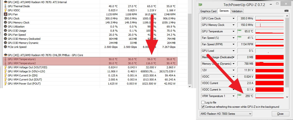 Народ всем привет, есть видеокарта 7870 от Сапифра гигагерц которая эдишн ))) Нареканий к карте нет никаких, все играется очень даже круто на FullHD, температура под нагрузкой 60-65 градусов, пропеллеры на ней еле крутятся и ее практически не слышно, воздух в системнике еле теплый, что подтверждает что адовых температур нет, так же проверял колхозным способом, вырубаешь игру и быстренько вырубаешь системник и трогаешь с обратной стороны руками текстолит, тоже вроде все впорядке. Но вот на скрине программы показывают какие то адовые температуры VRM. Собственно вопрос: Есть панель реобас с возможностью мерить температуру датчиками, в каком районе на текстолите разместить датчики и самое главное как их присобачить, чтоб был хороший прижим и снять реальную температуру ???