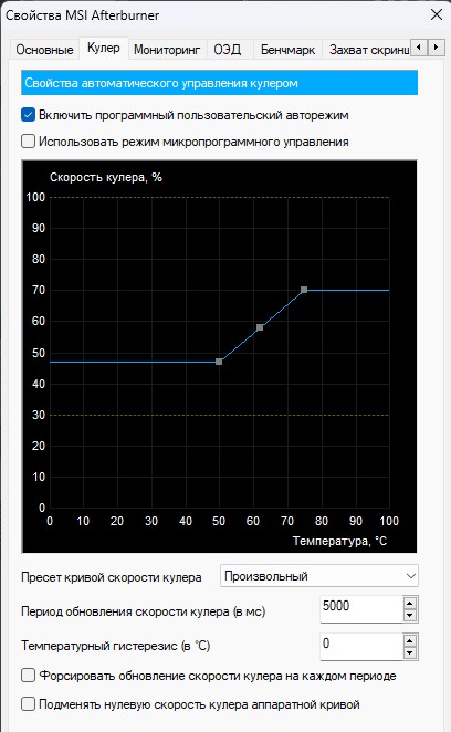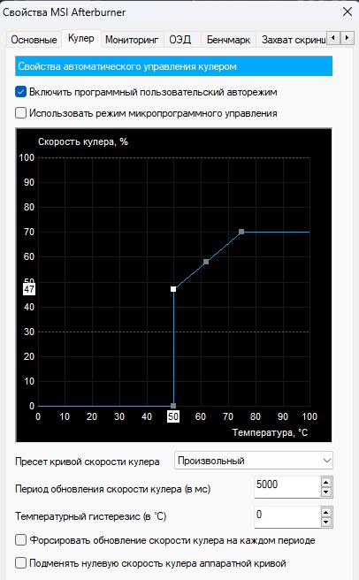 fan stop мне не нужен, поэтому настроил просто на минимальные обороты до 50 градусов, чтобы не было старт-стопов постоянных, слишком они шумные получаются на моей карте