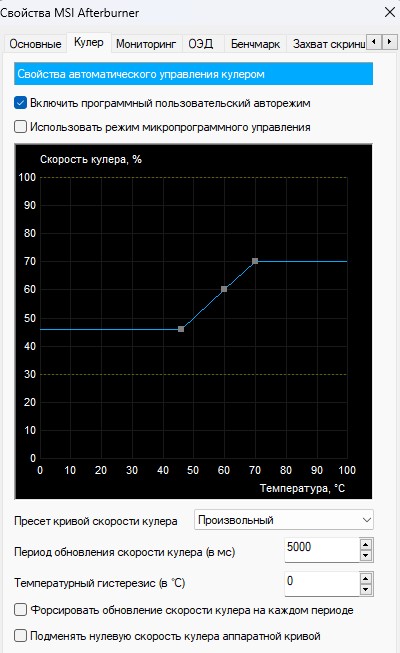 значит нужно создать отдельный профиль в MSI AB и там настроить кривую с минимальной работой оборотов от 45%.