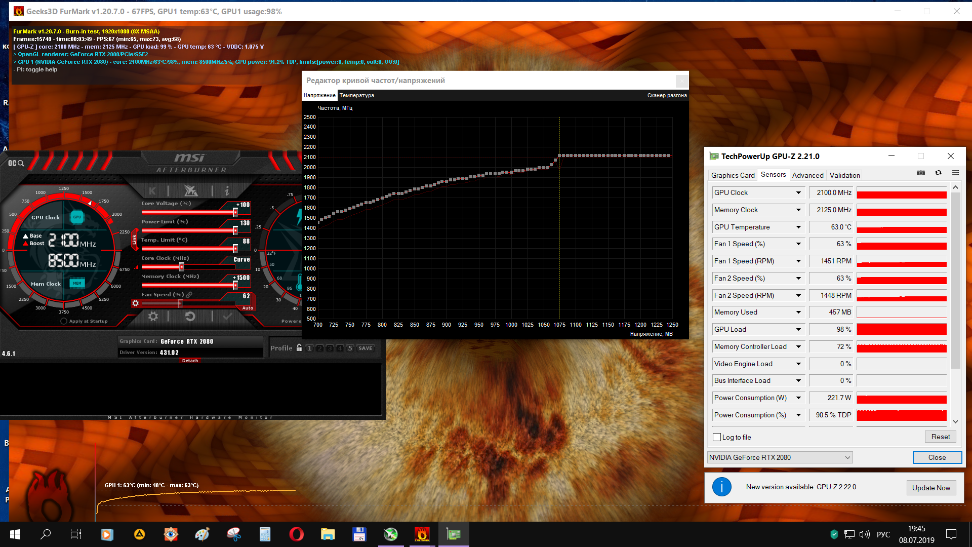 Привет всем. Сменил стандартную со на своей palit game rock premium 2080, на биквиты хай скорость 120мм. темп сразу минус 10 град. стабильно 2100 при 1075млв 63град. Выше не пробовал напряж пока, но вполне возможно как мин до 1085млвольт поднять в пределах 70град + 50мгц, думаю, еще можно прибавить. Прирост в 20%, с разгоном памяти вместе. В стоке вентили на 50% крутят, 1200об показывает, темп 60град. Что нибудь в пределах 1800-2000 об\мин подбирать надо на смену стандартной со. И странно ведет себя новый бублик(FurMark) Во первых общие очки изменились в 2 раза больше, и частота в тесте отображается бустовая, а не разогнанная. В целом результат с разгоном. Для выше фул хд, пишет, что не может, моник у меня full hd.