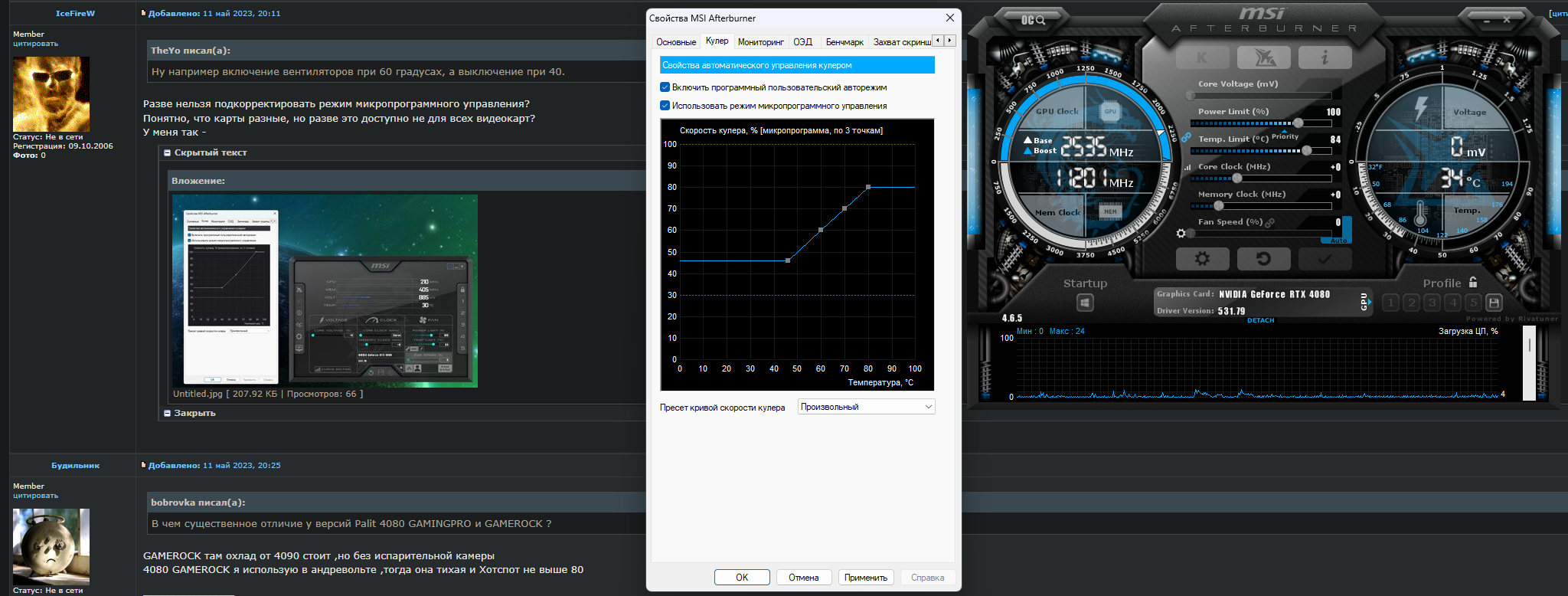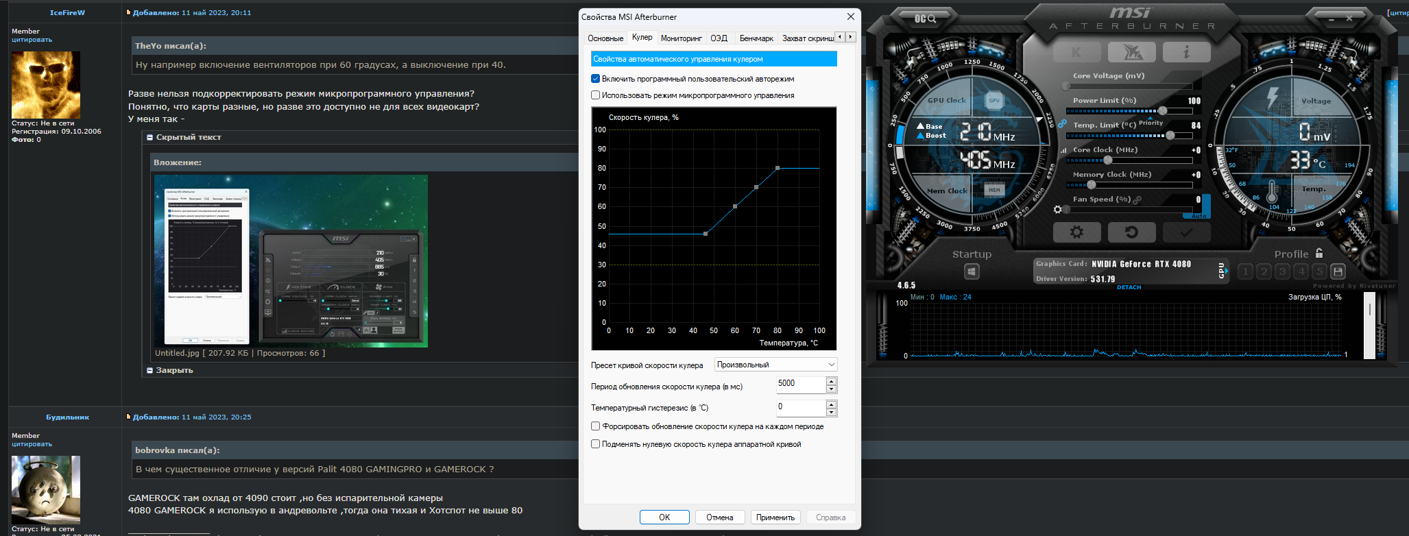 А причём здесь микропрограммное управление? Это опция для того, чтобы кривая записалась в саму видеокарту независимо от того запущен MSI AB или нет. С помощью этих кривых нельзя настроить коридор, нельзя сделать так, чтобы вертушки включались на 61 градусе, а выключались при достижении температуры в 40.