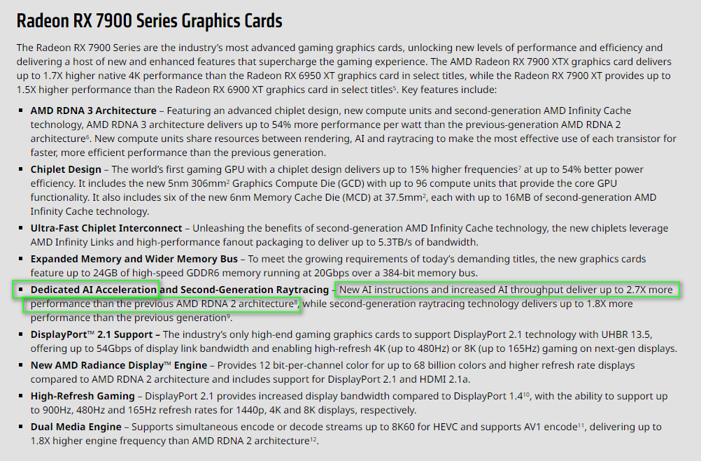 RDNA 3 has dedicated AI acceleration which can improve AI-based performance by 2.7x and also benefits ray tracing instructions, similar to Nvidia's Tensor cores.