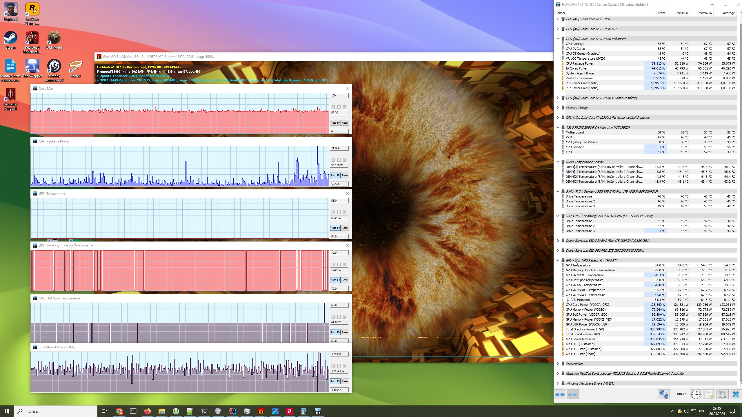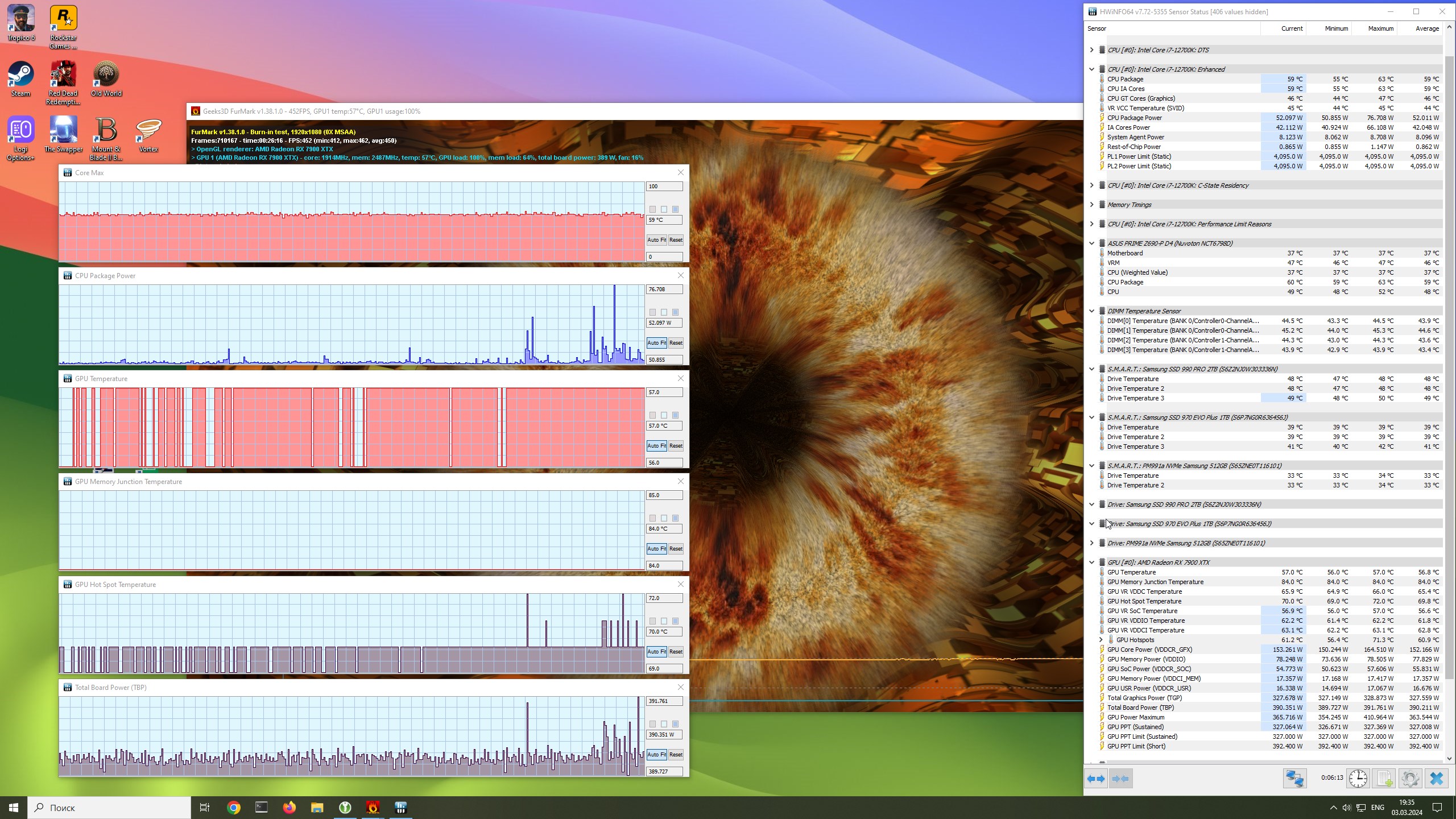 400W GPU limit, 27 в комнате, 420 рад, обороты 700 rpm, боковая крышка открыта, вода 36 ptm7950 уже стоит, но на памяти обычные термопрокладки.