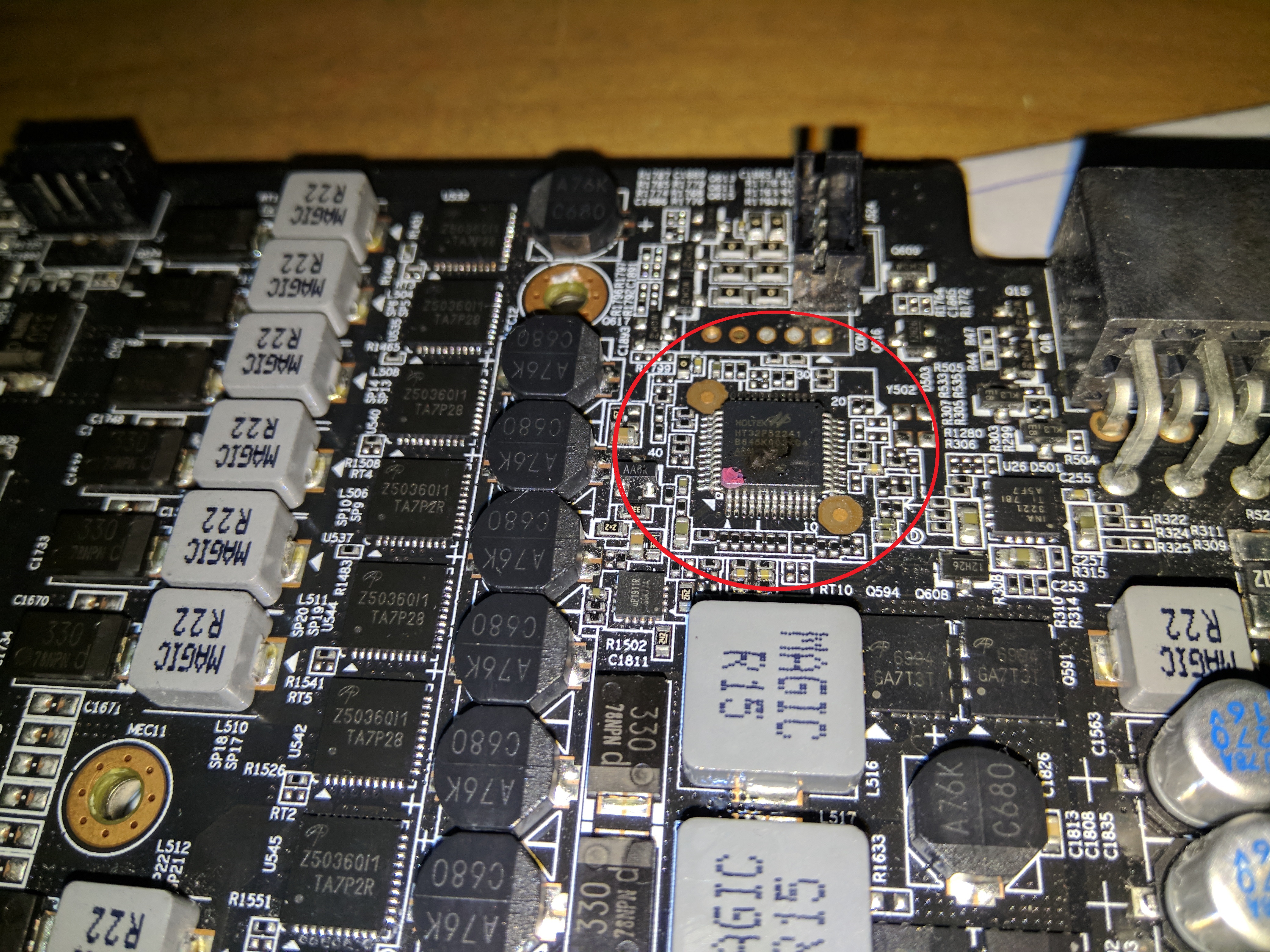 Собственно, на Aorus 1080ti вчера сгорел чип Holtek HT32F52241. Сама видяха работает, как ни в чем не бывало.. Только пропала регулировка подсветки видеокарты. Насчет вентиляторов не скажу, т.к. стоит водоблок, может и они не работают. Погуглив, определил, что этот чип может отвечать за мониторинг, подсветку, вентиляторы..по разному в разных видеокартах. У меня подсветка пропала.. Сам чип:
