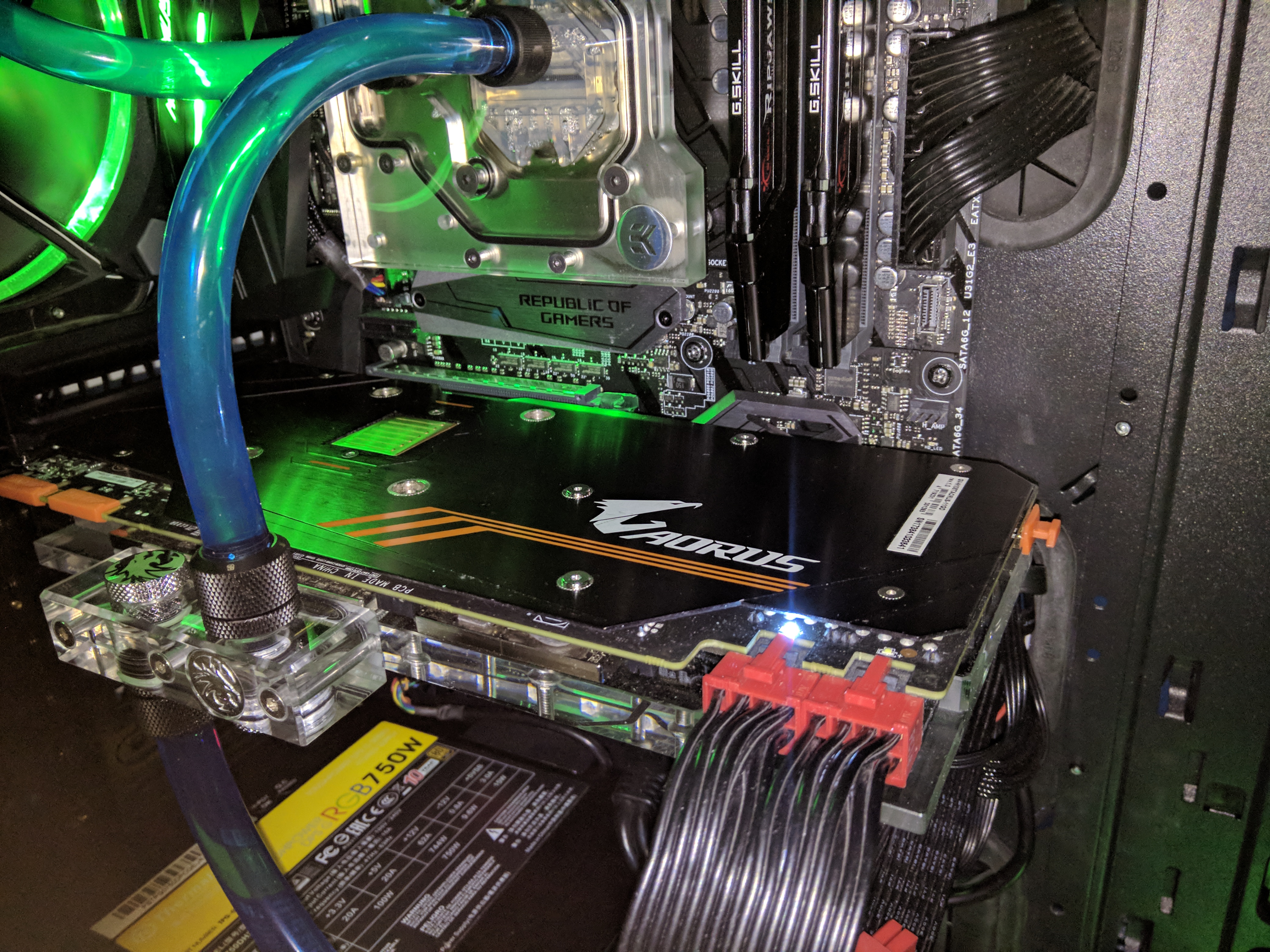 В общем позавчера разбирал контур, а вчера собрал его, прогнал из-под крана холодной водой. Дальше собрал, запустил, все было нормально. Включил Фурмарк для теста и через некоторое время заметил, что горят сигнальные огни на обоих разъемах питания..небольшой запашок учуял [совсем немного]. Пришлось разобрать, там уже увидел чип в плачевном состоянии.. Собрал обратно, все работает.. Диод горит уже на одном разъеме питания. [но они гореть не должны в рабочем состоянии]