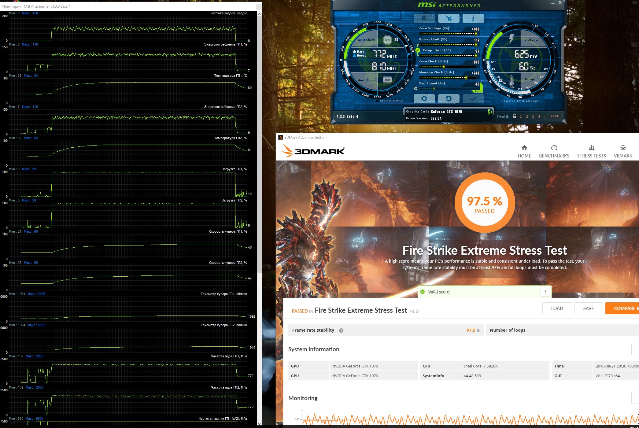Видеокарта MSI GeForce GTX 1070 GAMING X 8 Гб GDDR5. Решил обратно поставить MSI Gaming APP (от 2016-08-04), хоть и запускается она ровно три минуты. В ней и переключатель есть, чтобы вентиляторы не останавливались (на 36% вращаются), и режим "ОС" можно включить, и мониторинг в играх показывает. Ну еще подсветкой на видеокарте можно побаловаться и режимы экрана выбрать (Gaming например). Режим "ОС" перед игрой включаю и отключаю остановку вентиляторов. В GTA 5 все на максимум (абсолютно все настройки вправо) - FPS 60, температура 61°-62°. Но в машине, на скорости, в городе FPS до 50 может проседать, в траве вообще до 35 FPS просадки видел. В Tomb Raider (2013) тоже всё хорошо (на максимум конечно настройки) - FPS 60, температура 50°-55°. В Battlefield 4 всё на ультра+разрешение 150% - стабильные 60 FPS, и температура всего 50°-53°.