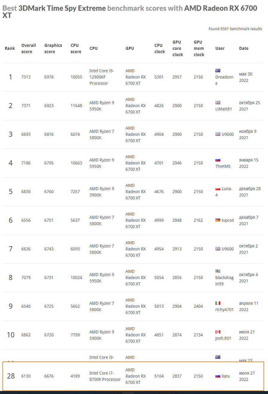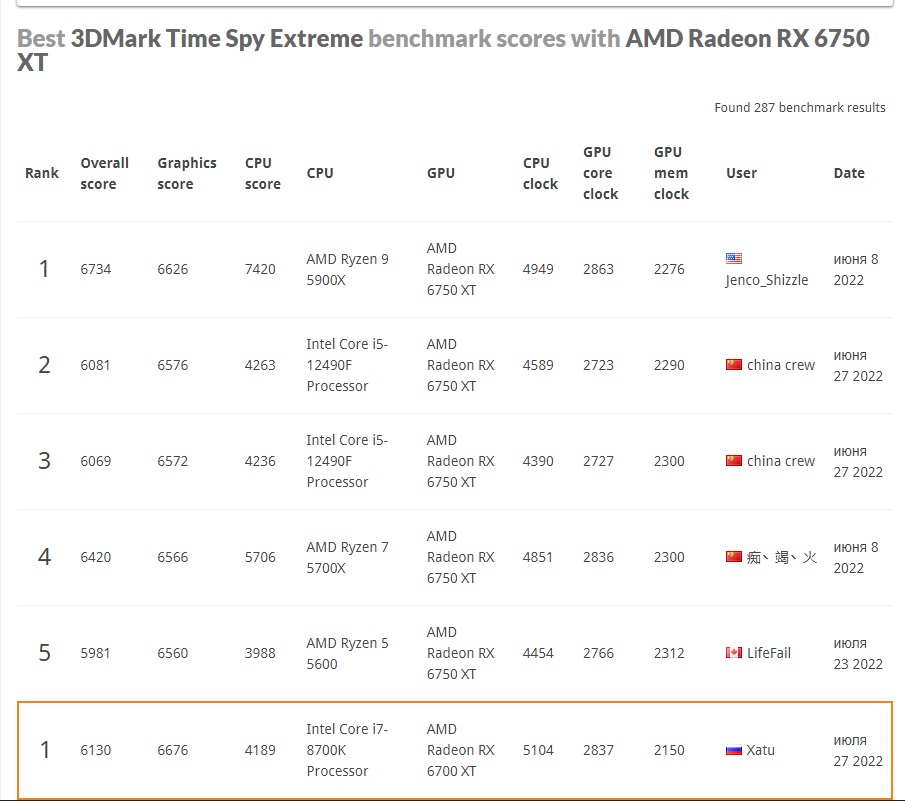 Да просто 6700 XT у людей на руках давно, да и желающих разогнать их в щи было больше (новая архитектура, всё такое), а 6750 XT вышли недавно - не будут же люди, имеющие на руках 6700 XT менять их на 6750 XT, верно?) А вот новые владельцы уже не из тех, кто гонит их любой ценой ради достижения каких-то там супер-результатов в бенчах (и высоких строчек в рейтингах). Ну, это моё видение ситуации) Ну и на скрине 6700 XT гнали на 2900+ большинство как бы