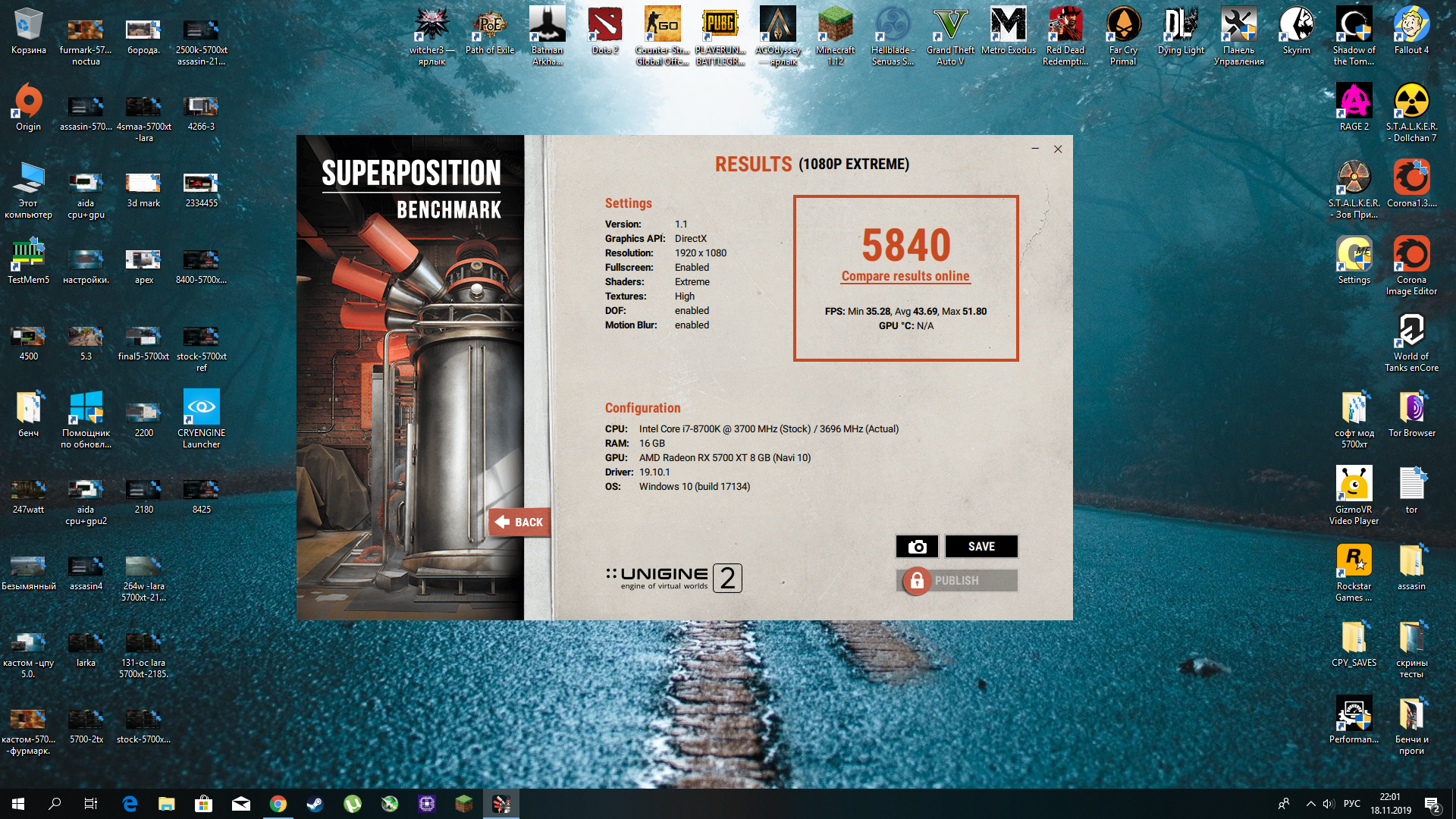 - Установить последнюю версию Windows 10 1903/1909. Как это сделать можно прочитать здесь https://www.microsoft.com/ru-ru/softwar ... /windows10. - Осуществить подключение питания карты рекомендуется двумя отдельными кабелями во избежание возможных проблем с блоком питания, с самими кабелями и пиковым потреблением. - Использовать блок питания рекомендуемой производителем карты мощности. - Необходимо учитывать, что некоторые запущенные программы по мониторингу (afterburner, gpu-z и подобные) могут вызывать различного рода проблемы в работе карты и поведения карты в игре (статтеры, снижение fps, сбой в работе вентиляторов). В некоторых случаях были проблемы c оверлеем Adrenaline. (данная рекомендация может считаться устаревшей, в случае использования последних версий драйверов и обновлений Windows) - Разгон оперативной памяти может вызывать статтеры, вылеты или черные/синие экраны, если он был произведен без должного тестирования памяти на стабильность. Поэтому перед проверкой карты и ее разгонного потенциала рекомендуется сбросить разгон процессора и памяти (пример, ещё пример, ещё пример и ещё). - Порядок установки новой карты: установить новую ОС -> установить драйвера чипсета -> установить прочие драйвера -> установить драйвер видеокарты - Рекомендуется переустанавливать драйвер после переключения БИОСа на видеокарте, чтобы он (драйвер) корректно интерпретировал новые настройки (эта рекомендация Sapphire, написанная на бумажке, которая вложена в коробку с видеокартой). - Рекомендуется заполнить табличку OC potential of RX 5000 series - Проверить карту стресс тестами и играми (в том числе при при разгоне) в стоке со сбросом любого разгона (в т.ч. памяти и процессора): 3DMark Time Spy, тест на стабильность, 20 прогонов - Одна из рекомендаций по отлову черных экранов и проверки системы на стабильность: LinX (задачи 40000) + Kombustor (1080р), вместе включаем и смотрим приблизительно полтора часа. Предварительно выкрутить вентиляторы карты и системы на максимум во избежание перегрева.