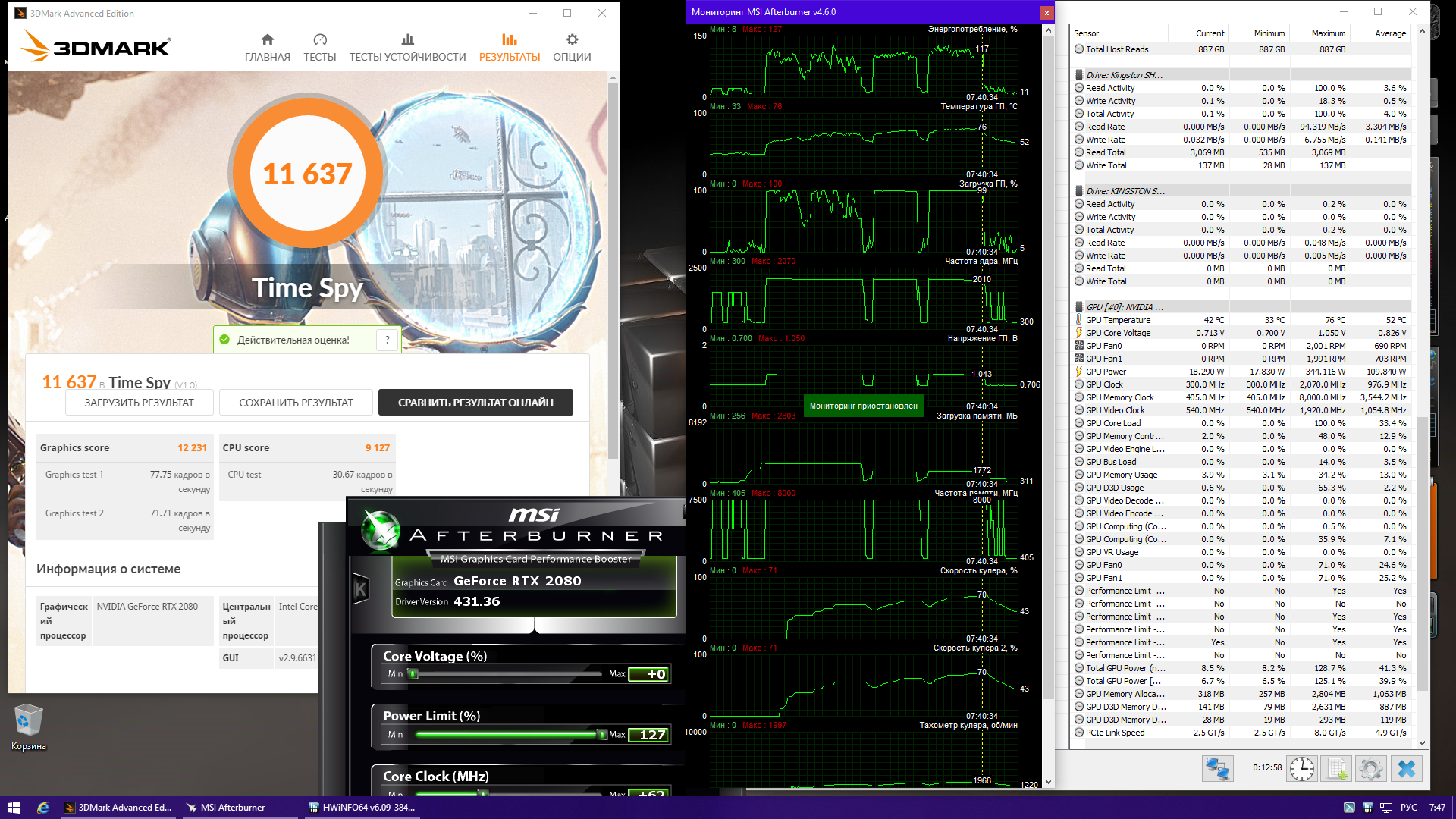 На вашем скрине понял, то, что вы разгоняете не по курве и таким образом, судя по всему получаете при коридоре 2050-2020 напряжение на чип 1.05в автоматом и эти самые 340Вт. Вполне ожидаемо, но все равно много. Повторюсь, если через 2-3недели будет актуально, сделаю прогон тайм спай именно с 2080.