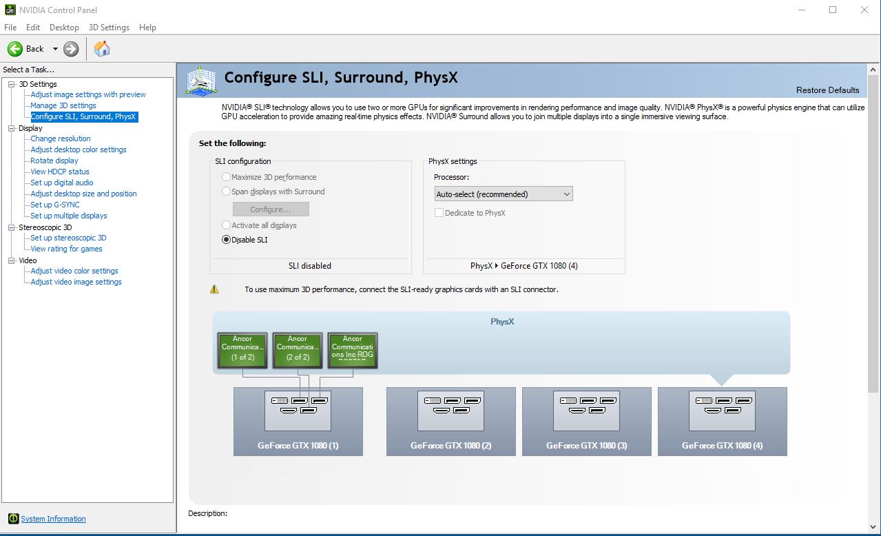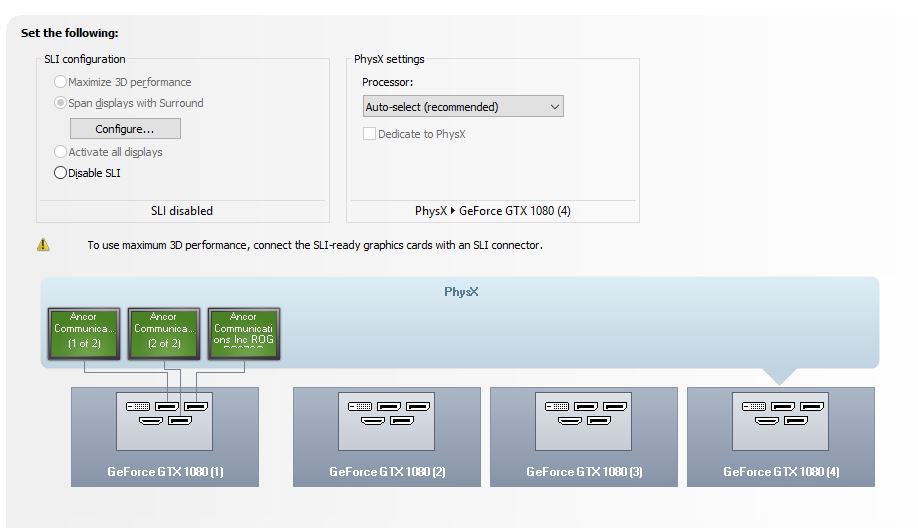 все привет есть рабочая станция DELL PRECISION T7910 (7910-0323), (2)*E5-2620v4 (2.1GHz, 8C). В неё воткнули две nVidia GeForce GTX1080 Ti ASUS Founders Edition PCI-E 11264Mb (GTX1080TI-FE), поставили мостик, но в панеле управления nvidia не появилась вкладка с sli.