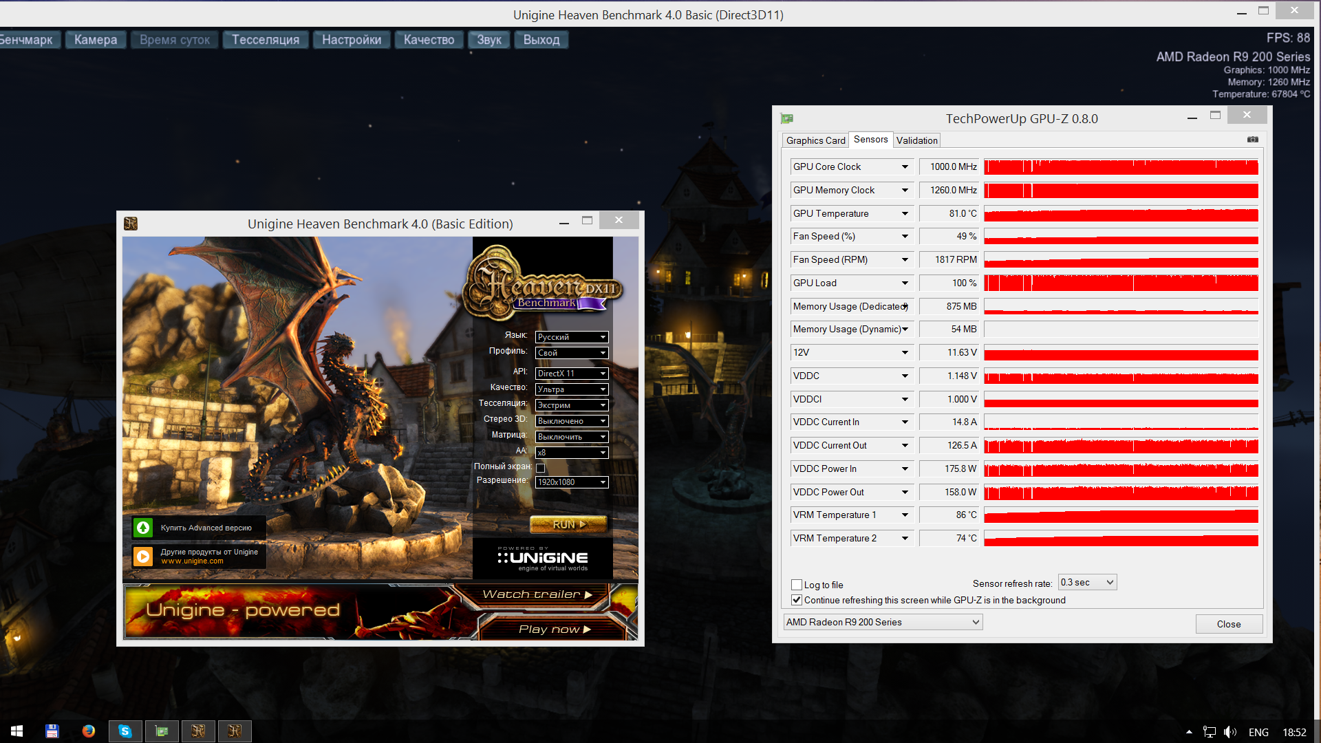 tiger403 опенгл я так понял жестко греет, не так как директ икс, вот результат хевена, минут 10 где то гонял, температура варьировалась опять, только с 79 до 82, настройки показал, можете попробовать тоже, интересно будет сравнить