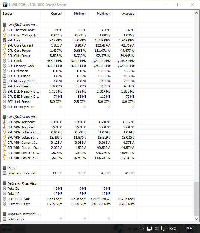Прогнал щас Деуса, температура 55-58 градусов, загрузка 99%-100%, частота в пределах 1100 МГц.