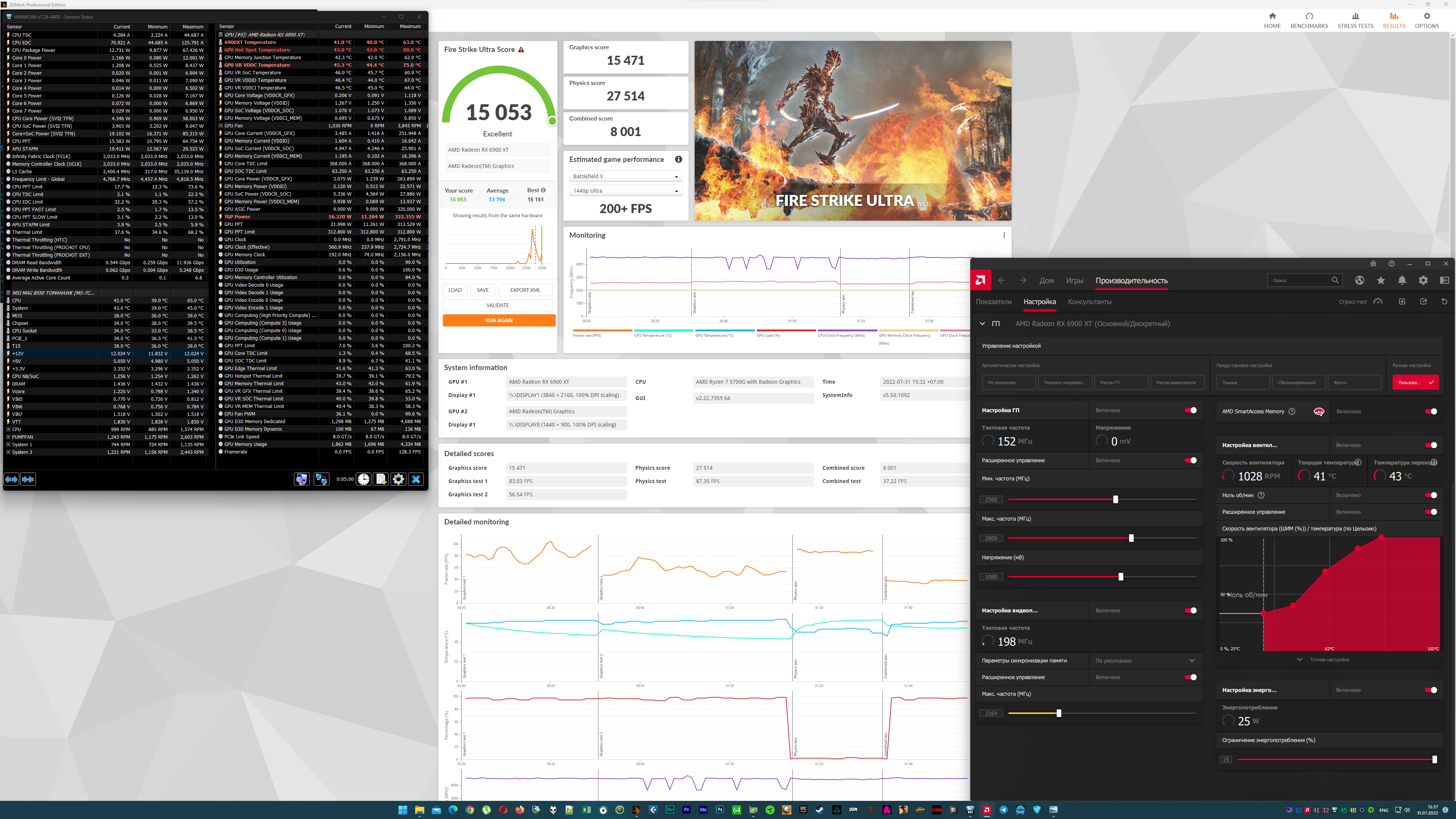 Т.к. эта 3080Ti почти везде упирается в PL (340-350W по мониторингу, при заявленных в биосе 370W, х.з. почему так) был сделан андервольт, при котором редко карта упирается в PL, далее к примерно этому же значению было приведено потребление 6900XT