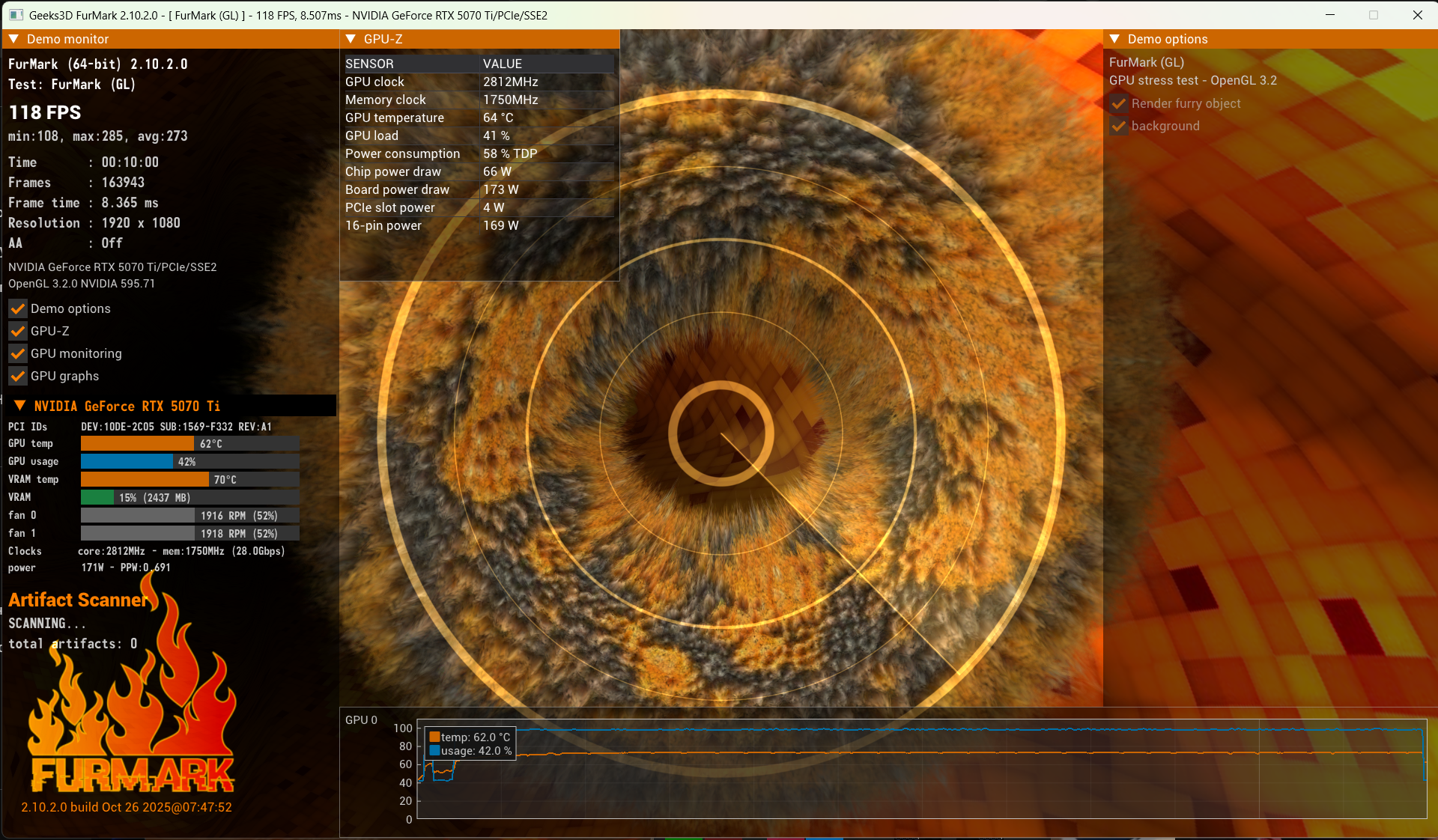 ser255 171 ватт? Странно, чего это фурмарк так поскромничал? Для такого потребления 1900 оборотов, 64 градуса чип и 70 память - многовато, конечно. Но полагаю, это какая-то ошибка. А что показывает Superposition (пресет 8К optimized)?