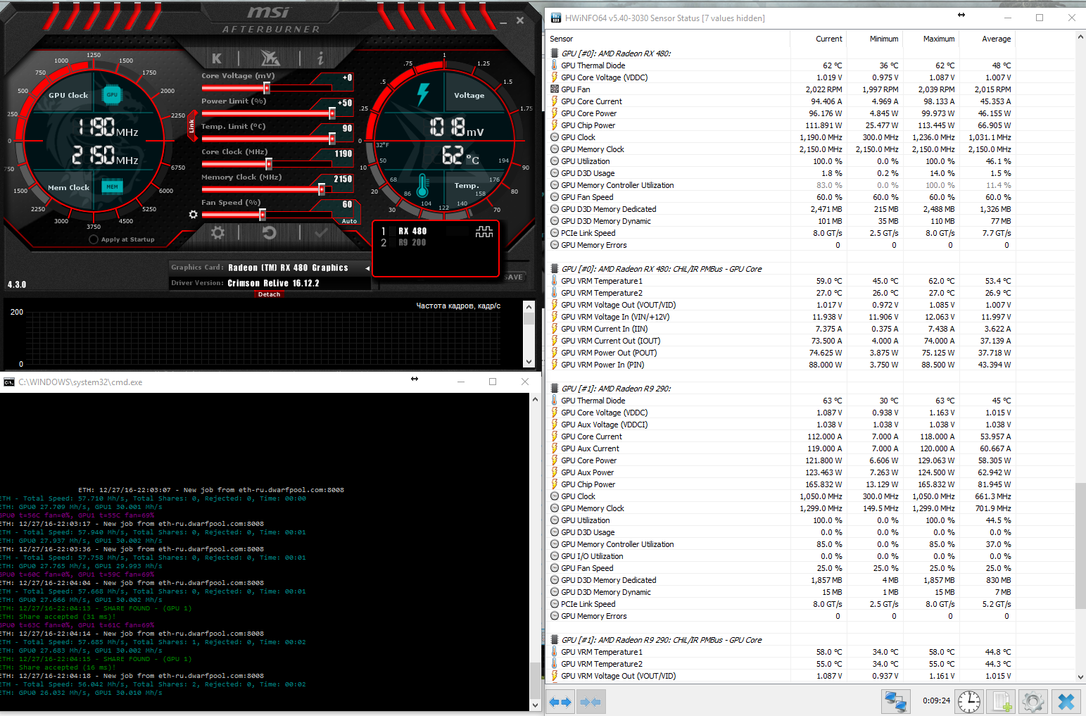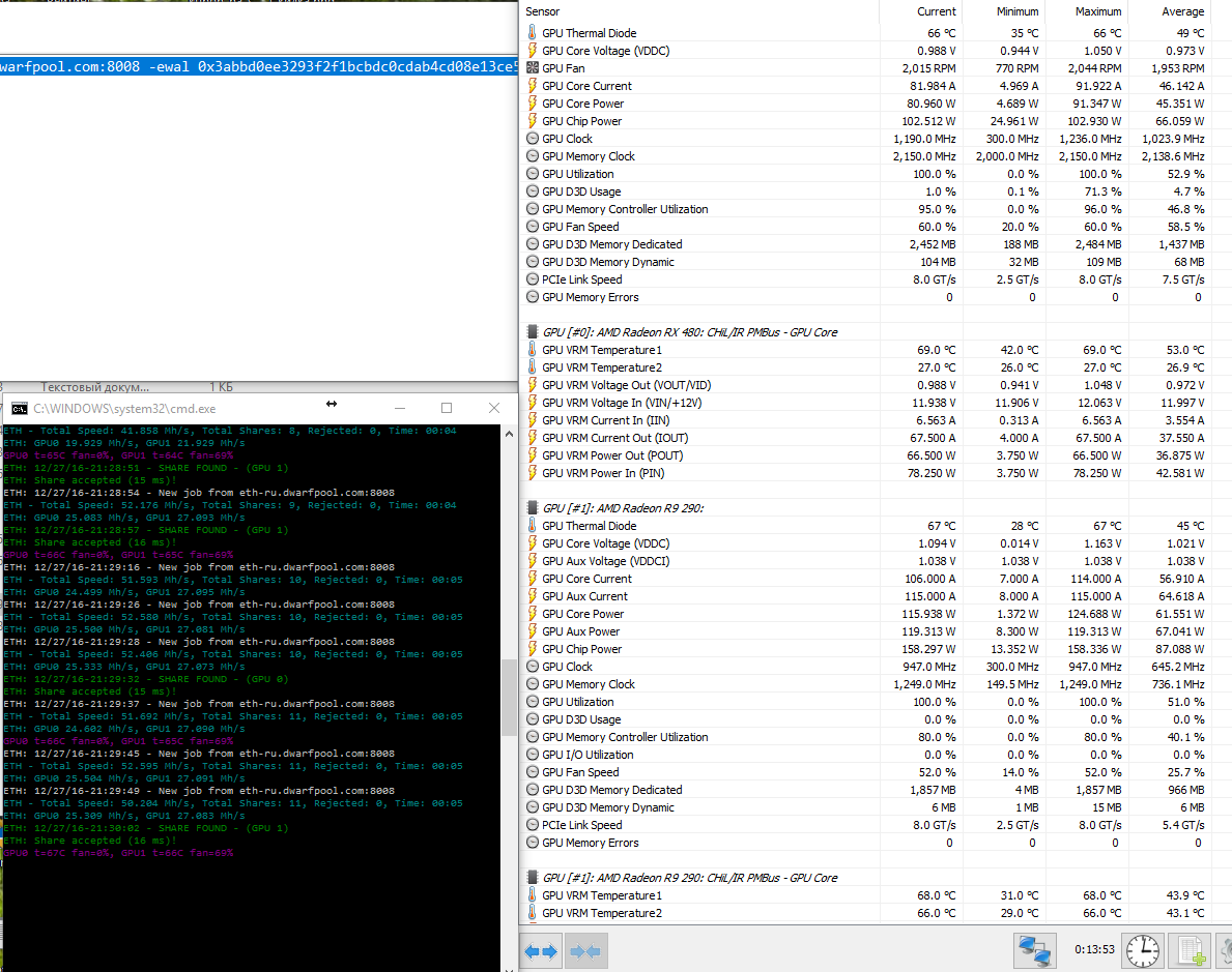 Сразу вопрос к остальным, в графе максимум HWInfo откуда такое безумное напряжение берёт 1.36в ? Если выше 1.15в я не вижу никогда и в ней и в MSI AFB. Причём сразу после старта системы иногда рисует. Попробуй ещё по разным батникам карты развести, у клеймора кажись на зеке глюк был, когда в одном батнике 480 с более старыми не уживались. У Divinity выше вообще 29 попугаев на 470. PS MSI AFB ещё какую то дикую версию дров у меня пишет, стоят 16.11.5, откуда оно взяло 16.10.3 хз. PPS ещё забыл, что бы применился разгон памяти, у меня надо перезагрузится, иначе все проги пишут новую частоту, но скорость, как со старой.